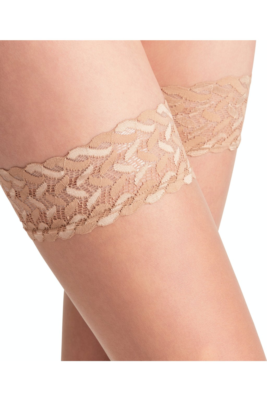 Samodržiace pančuchy bez špičky s tenkou ženskou ozdobnou čipkou, vhodné pre každý typ pleti. Ako make-up na pokožke - dodá vašim nohám jedinečný prirodzený vzhľad. Vďaka silikónovému poťahu sú absolútne protišmykové. Vzhľad 12 den.