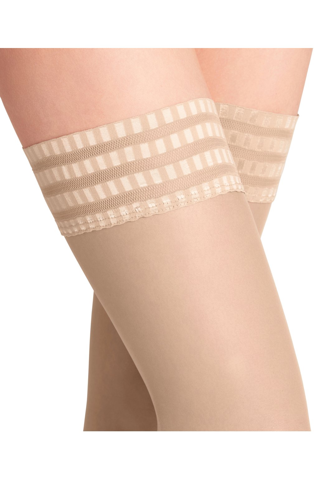 Čisté a nekomplikované. Tieto priehľadné samodržiace pančuchy s matným povrchom vytvárjú krásne a elegantné nohy. Elegantný materiál je zdobený nádherne krásnym pruhovaným pásom. Má vzhľad 20 denier. Jeho silikónový povlak zaisťuje absolútnu protišmykovú ochranu. Nenanášajte si krém na nohy. Špička má zarážku a mäkký šev.