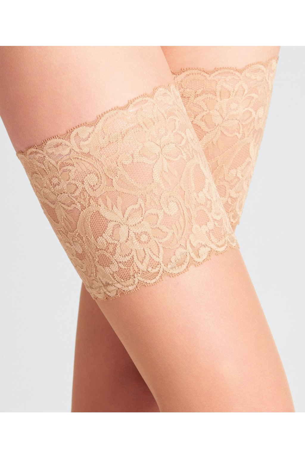 Elegantné samodržiace pančuchy s rovnomernou štruktúrou pleteniny zaisťujú hodvábny pocit na pokožke. Protišmyková silikónová vrstva a ľahko vystužená, nekrčivá špička a mäkký šev zabezpečujú najvyššiu úroveň pohodlia.
