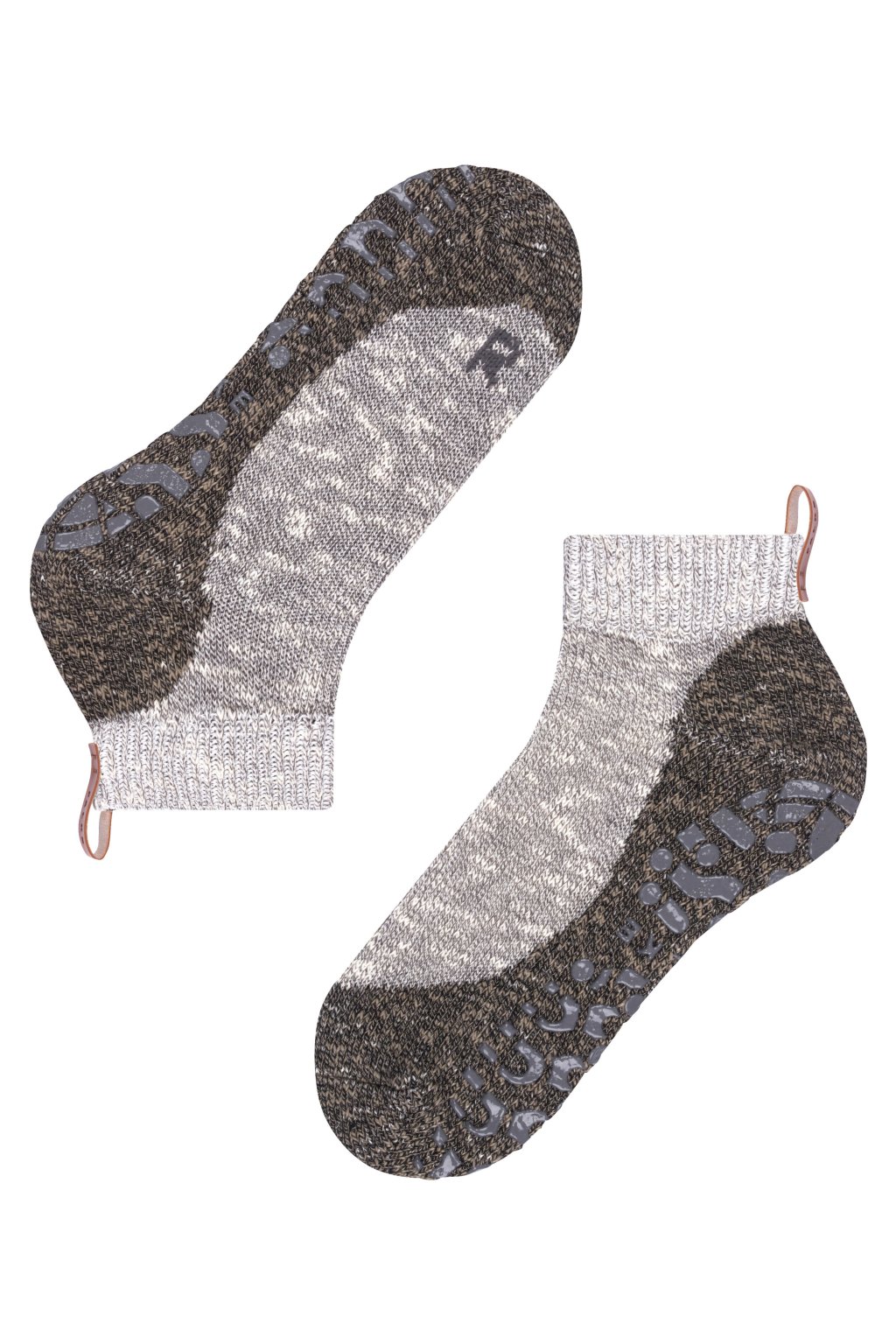 Pohodlné domáce ponožky na relax a oddych. Protišmyková potlač s výstupkami na podrážke zaisťuje lepšiu priľnavosť. Vďaka ergonomickému tvaru sa ponožky po dĺžku tenisiek perfektne prispôsobia chodidlu. Použitie mäkkej priadze a všitá vegánska kožená výstuha na päte im dodávajú robustný vzhľad.