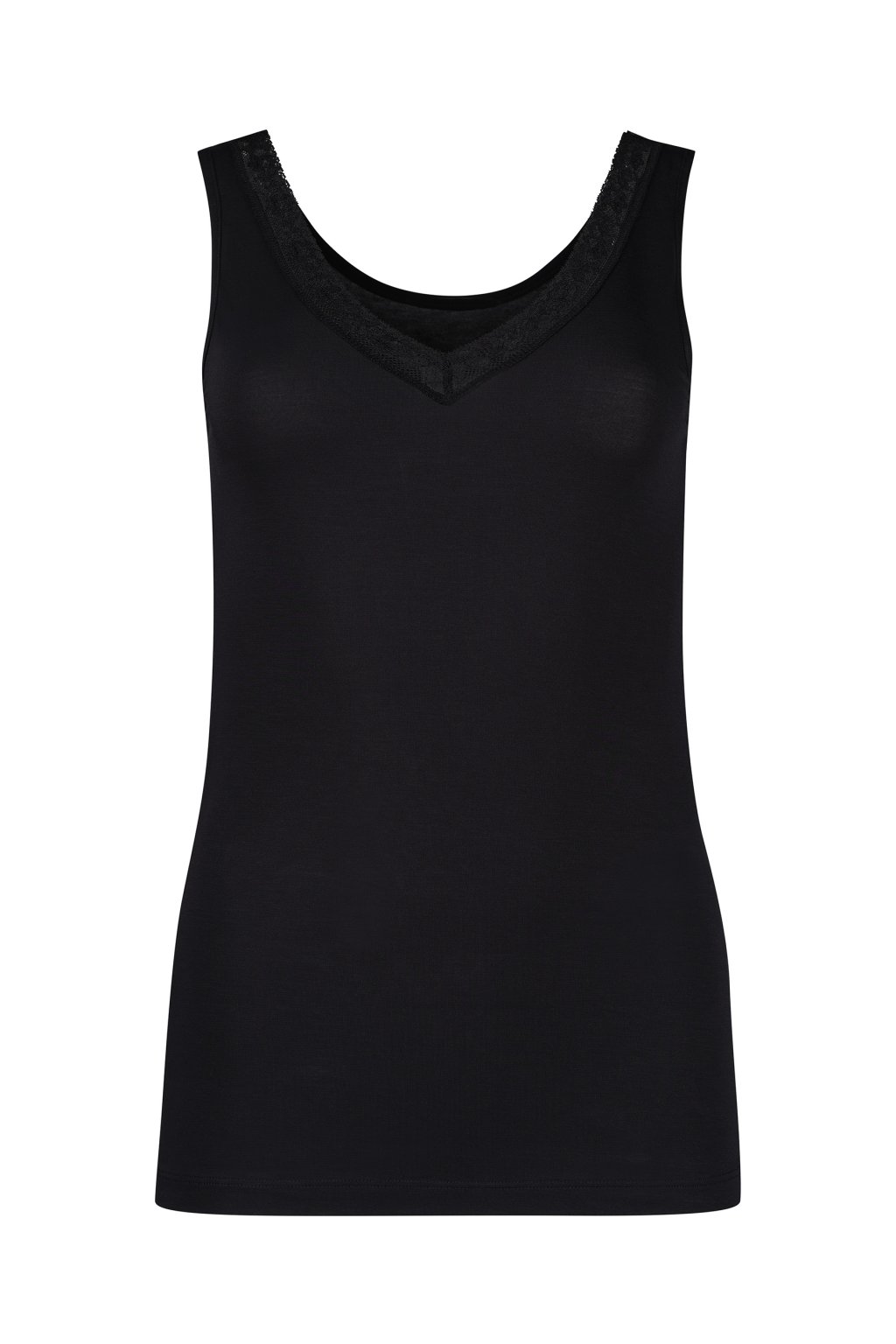 Dámske tielko z modalu a elastanu | Jemné čipkované vsadky vo výstrihu do V | Najlepšie pohodlie s dobrým pocitom | Úzke ramienka, perfektne padnúce | Výrazne kvalitný jednoduchý džersej z Rakúska