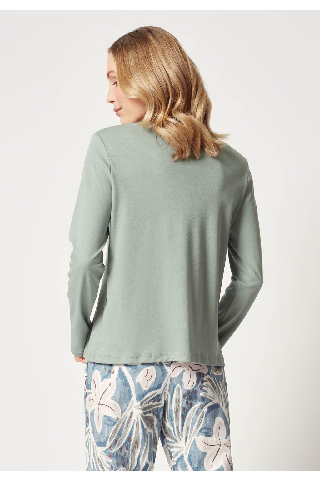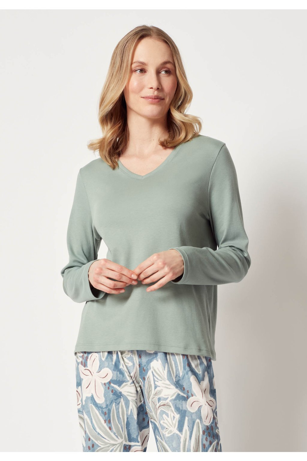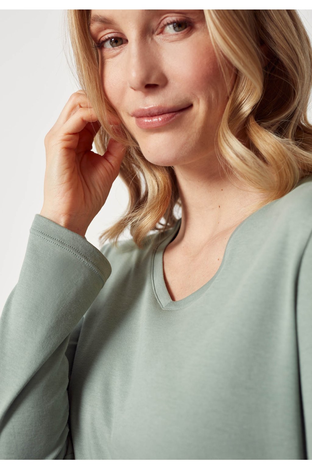 S klasickým výstrihom do V, pohodlným strihom a 100 % organickou bavlnou ponúka toto pohodlné tričko s dlhým rukávom pre ženy všetko, čo si žena môže priať. Vďaka mäkkej tkanine sa tričko perfektne hodí ku každému pyžamovému outfitu. Skvele vyzerá aj ako nadčasové tričko s dlhým rukávom s teplákmi.