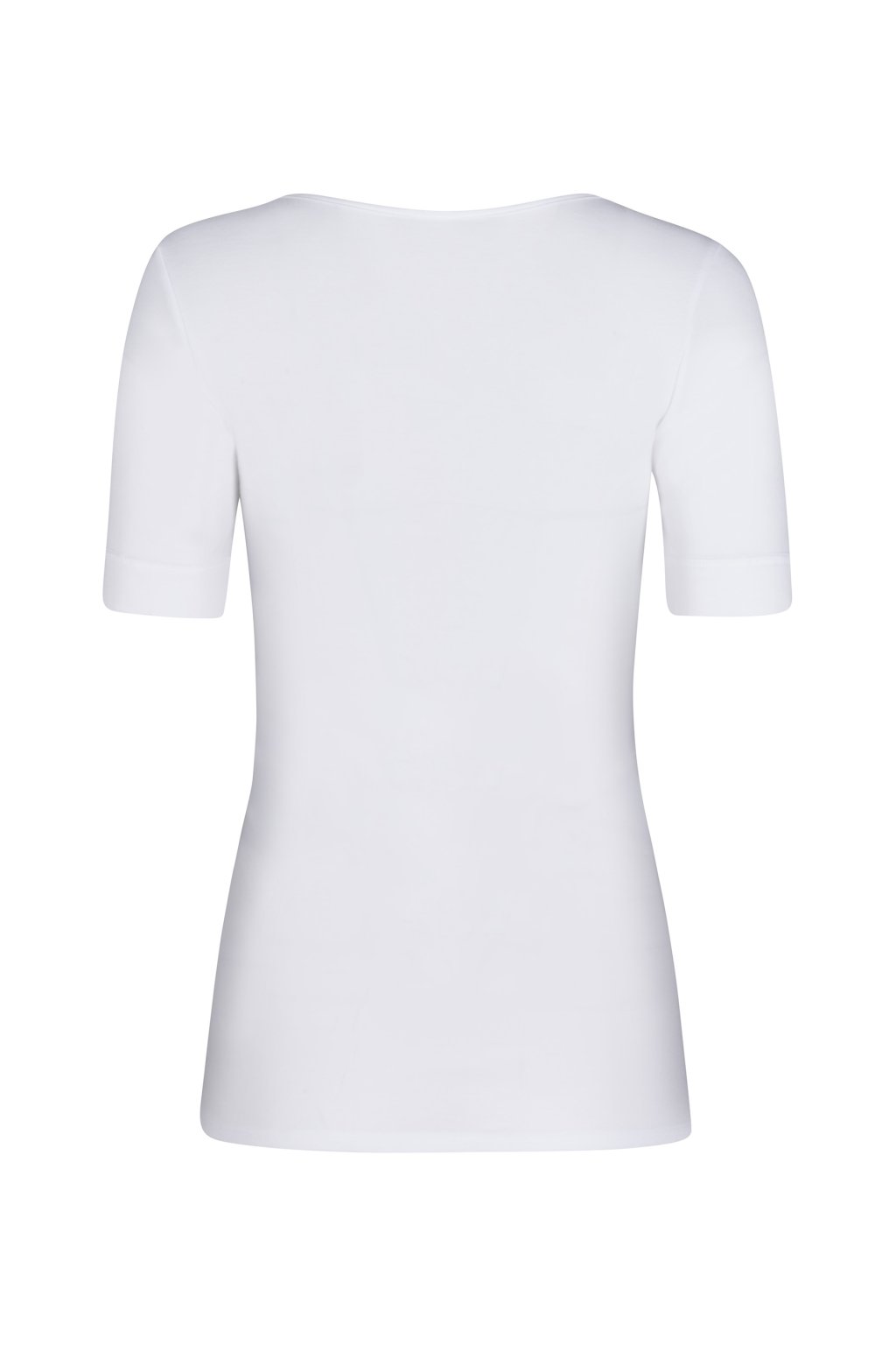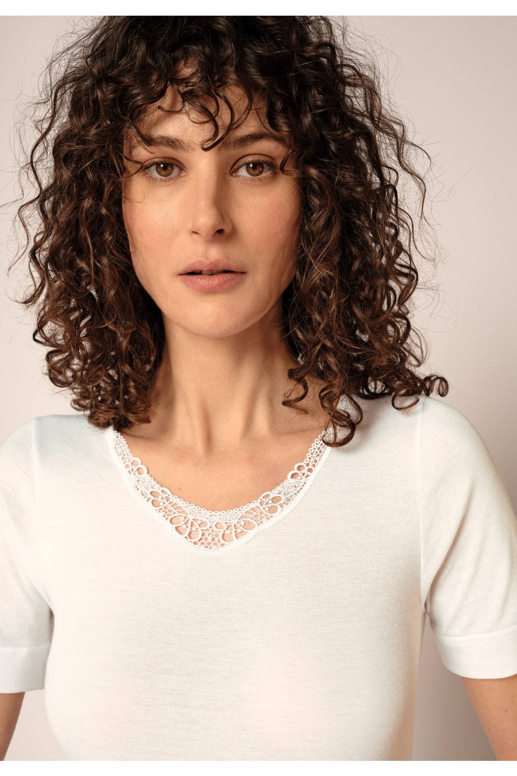 Tričko s krátkymi rukávmi a véčkovým výstrihom | Pekné detaily výšivky | Kruhový úplet bez nepríjemných bočných švov | Kvalitné rebrovanie zo 100 % bavlny | Ľahko udržiavateľný materiál priamo z Rakúska
