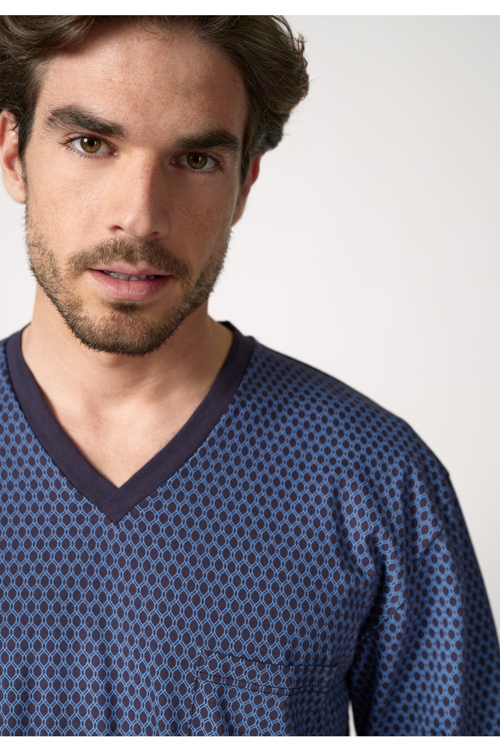 Rovný strih trička s dlhým rukávom a výstrihom do V | Vrchná časť pyžama s náprsným vreckom a manžetami | Zúžené pyžamové nohavice s manžetami a elastickým pásom | Odolný jednoduchý džersej zo 100 % bavlny | Vyrobené v Európe z látky z Rakúska
