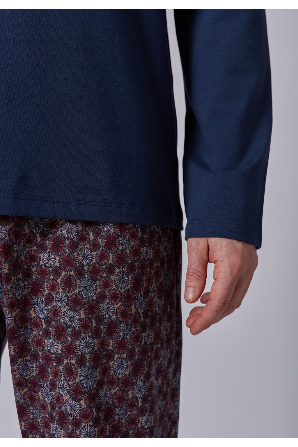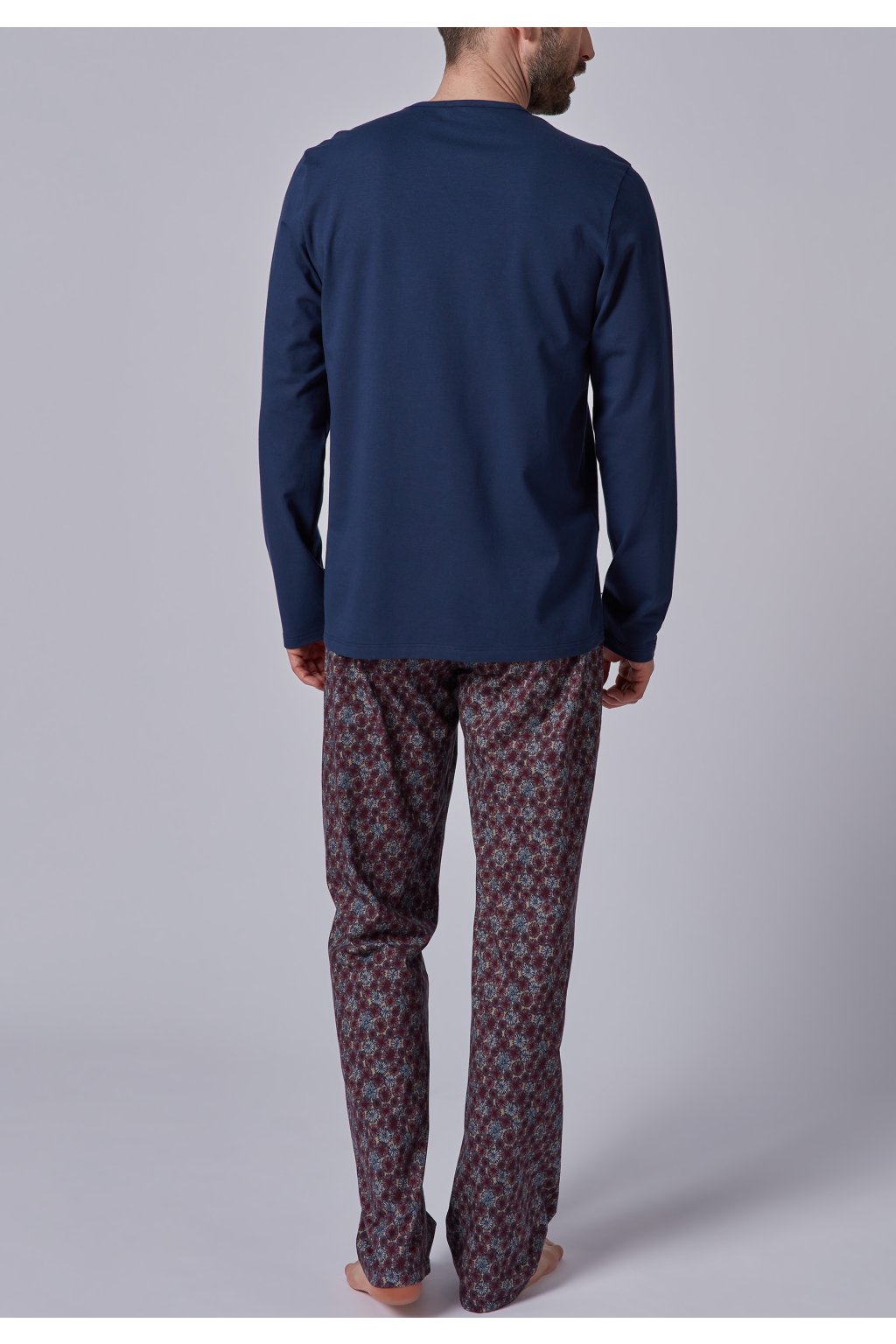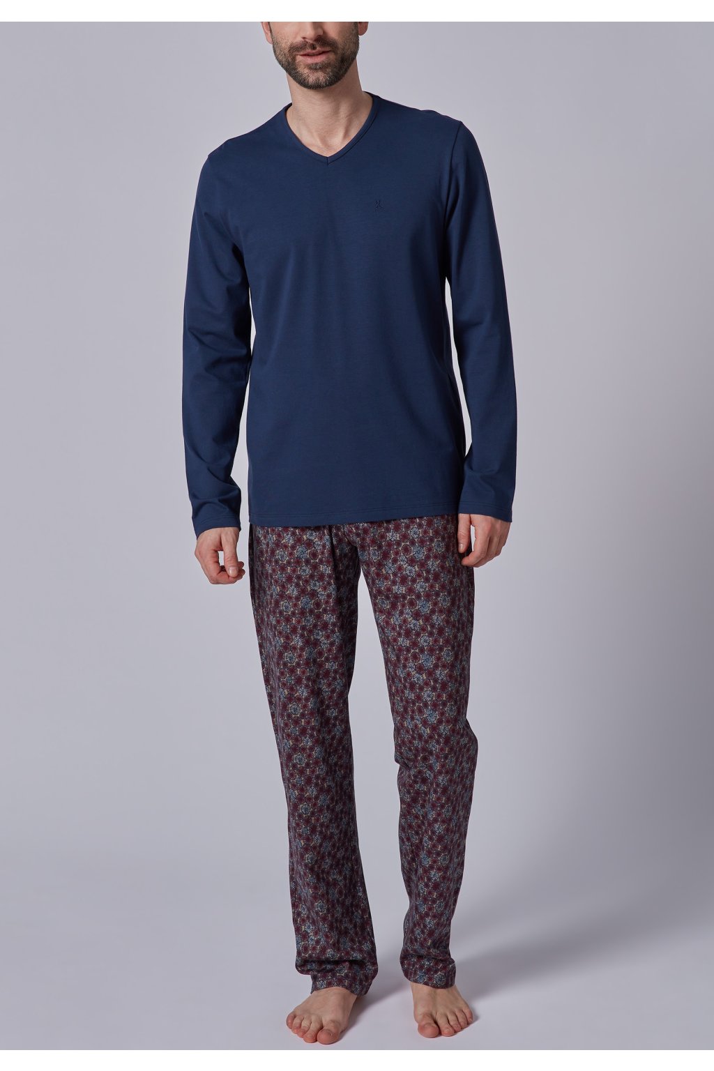 Dlhý pánsky pyžamový set z organickej bavlny; pyžamový top s výstrihom do V; pyžamové nohavice so sťahovacou šnúrkou