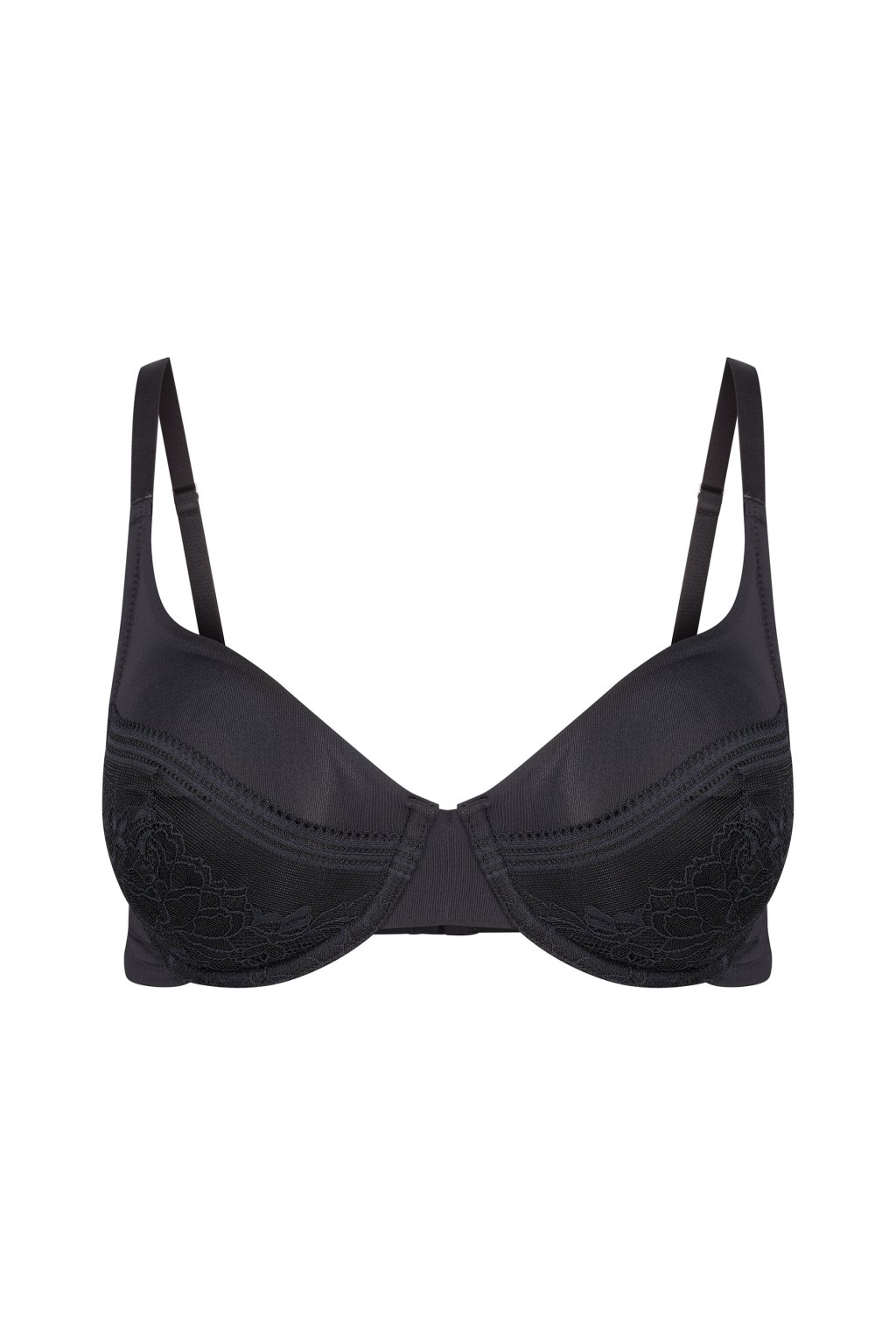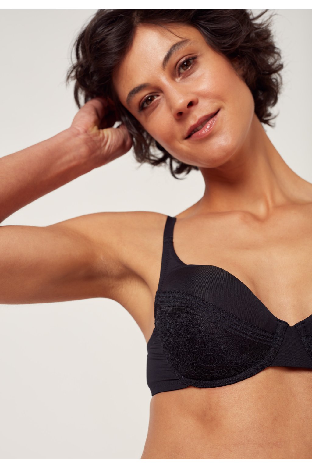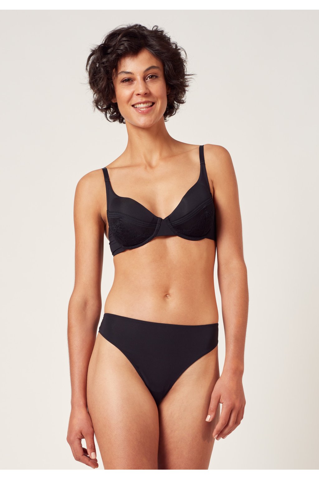 Dámska podprsenka s kosticami s nízkym strihom | Košíčky do polovice pokryté čipkou | Boky a kostice z jemného mikrovlákna | Nastaviteľné a priečne ramienka a zapínanie na háčiky | Čipkovaná podprsenka z recyklovaného mikrovlákna