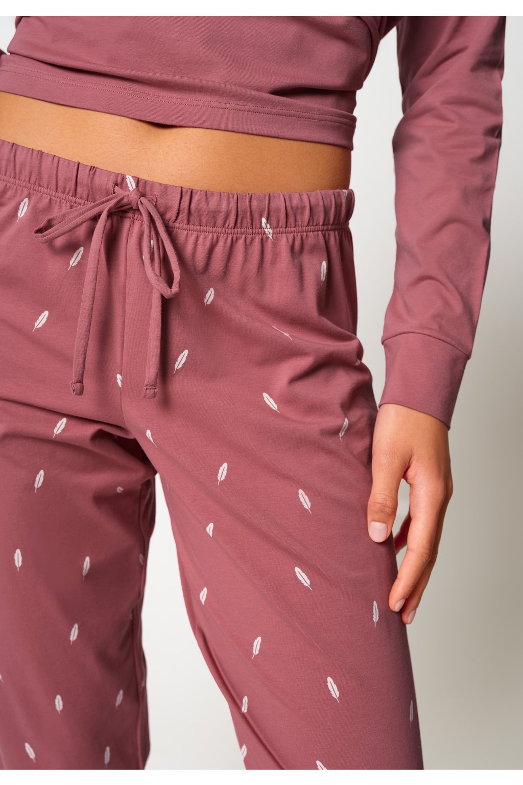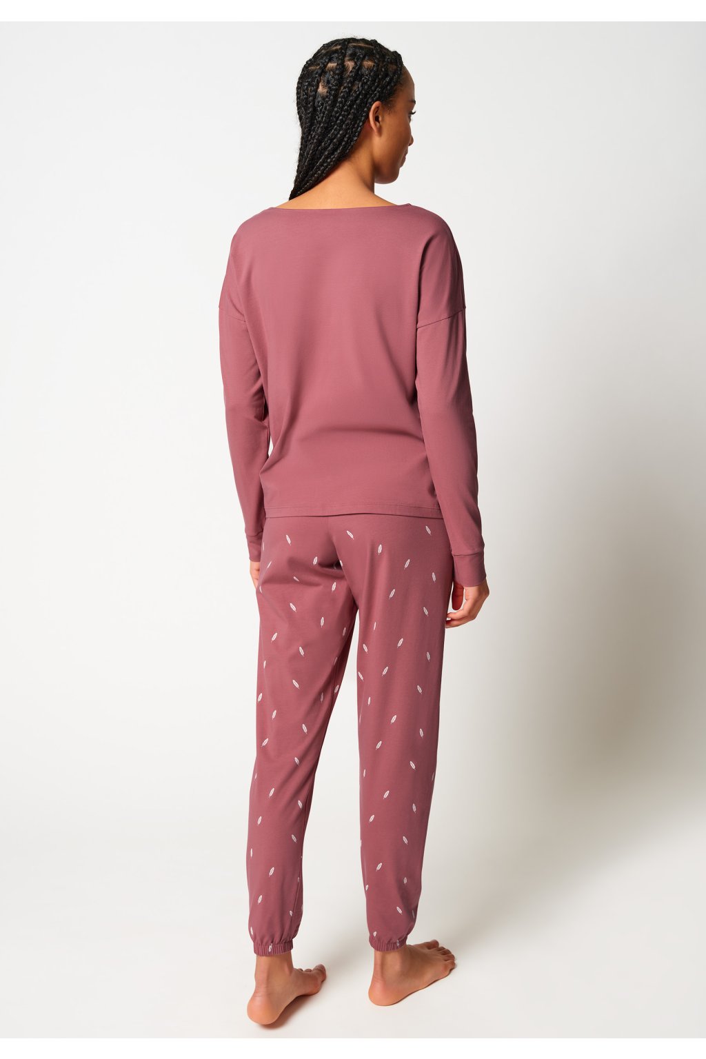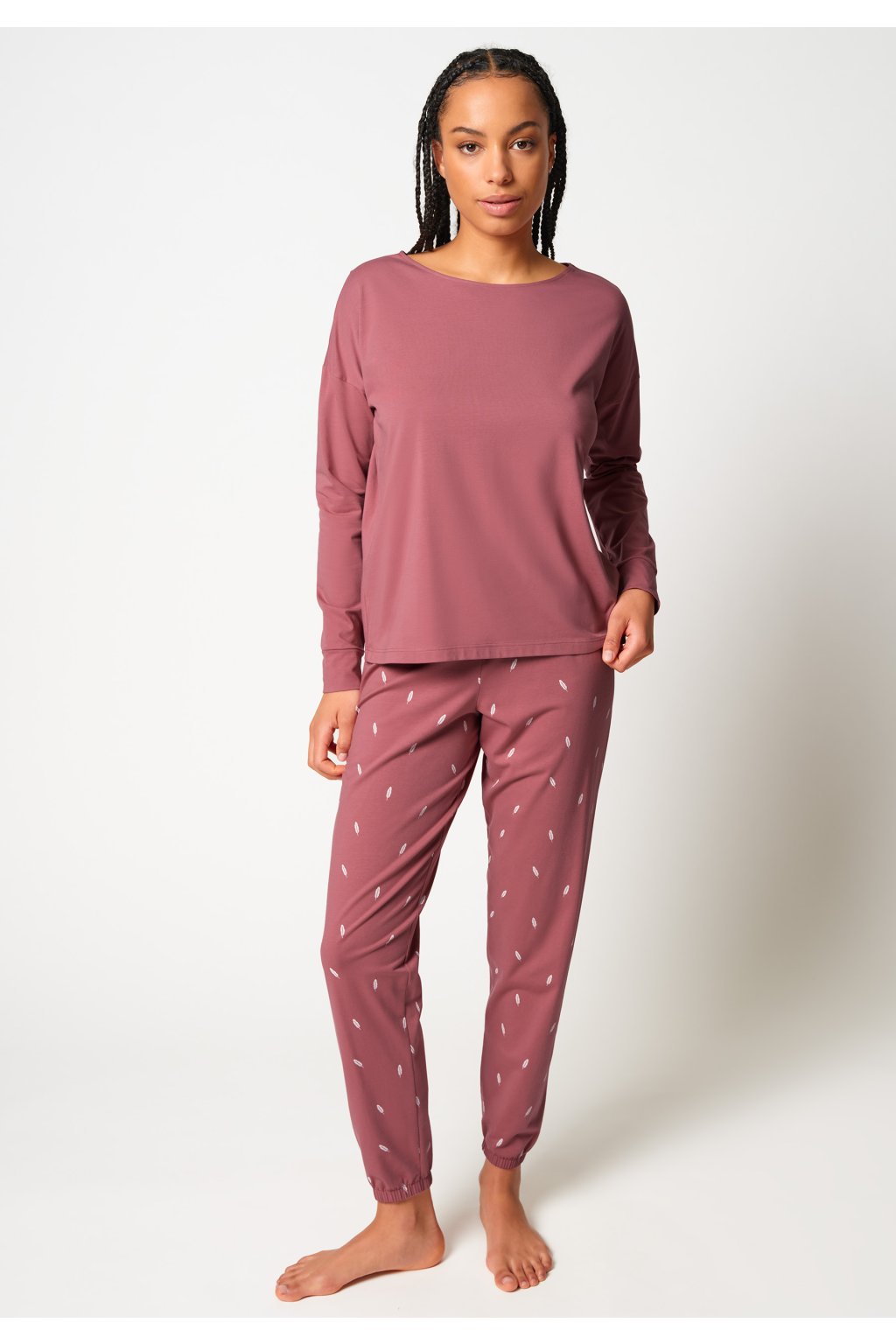 Dámska pyžama s dlhými rukávmi | Top s okrúhlym výstrihom a zníženými ramenami | Manžetové rukávy, zúžené nohavice s elastickým pásom | Elastický pás potiahnutý látkou s integrovanou látkovou sťahovacou šnúrkou | Pyžama vyrobená z vysoko kvalitnej bavlny s elastanom a elastickým pásom