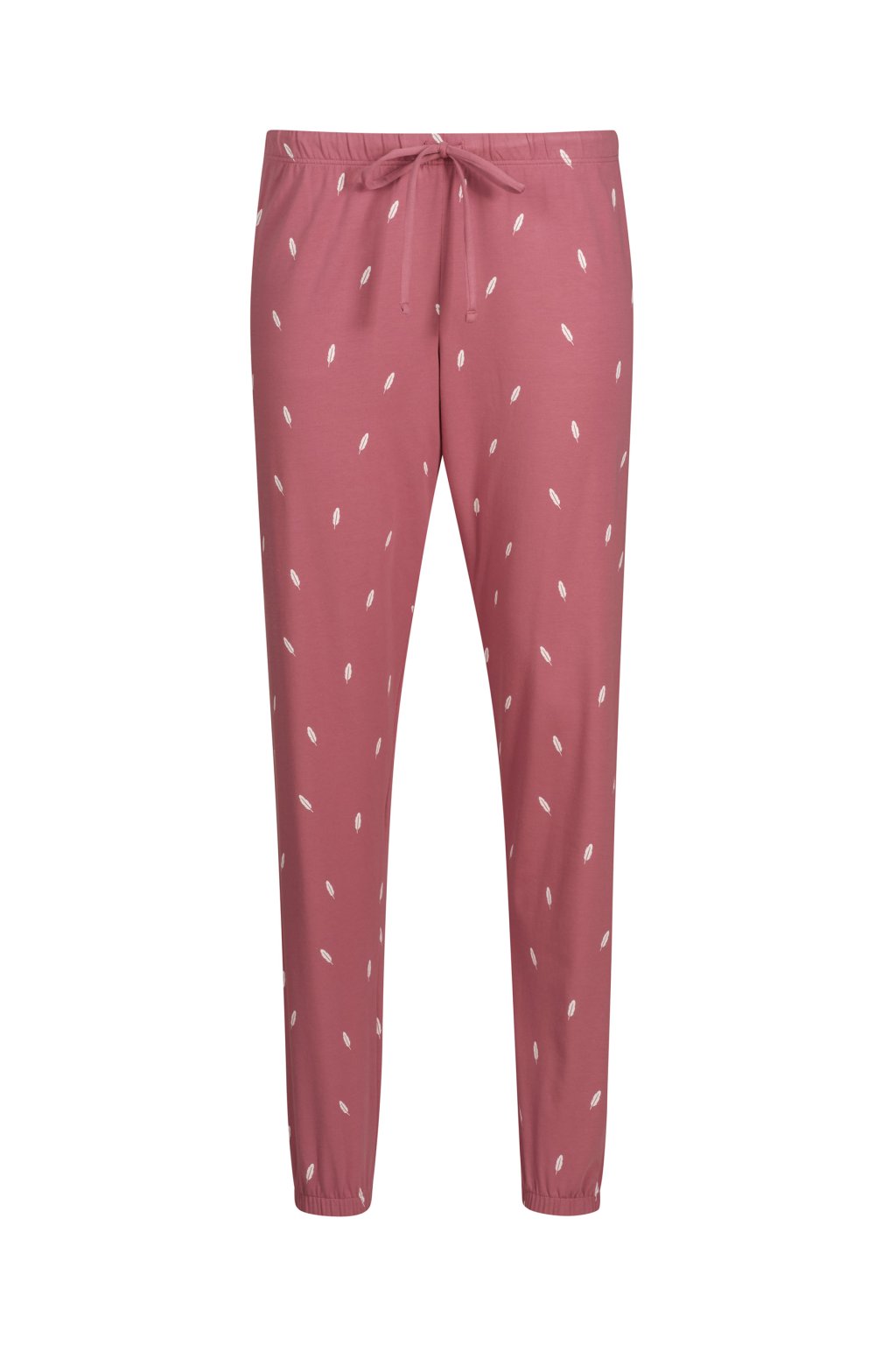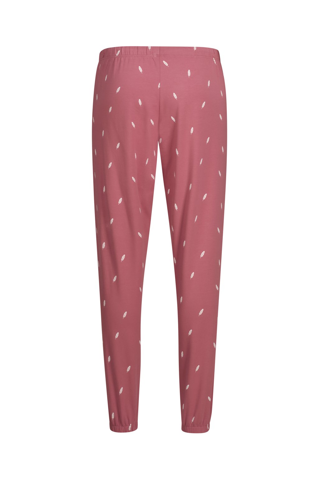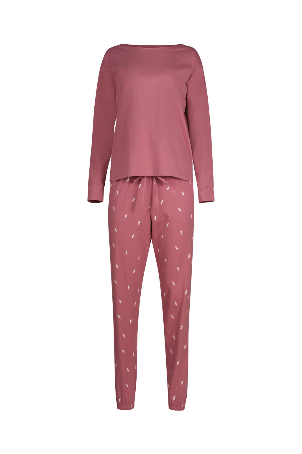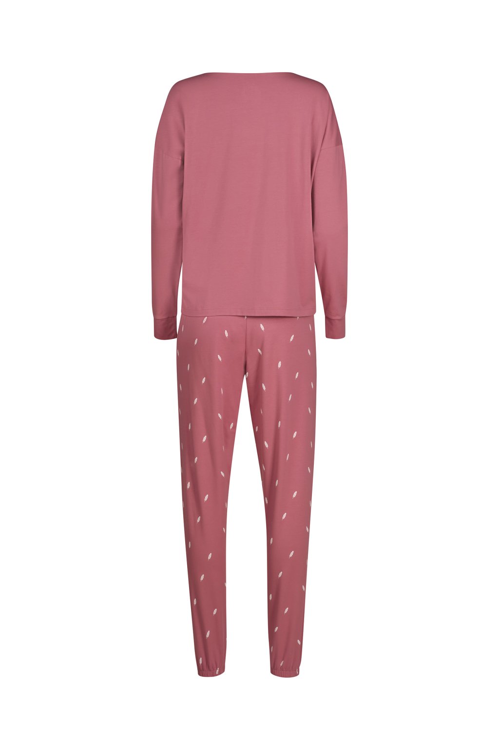 Dámska pyžama s dlhými rukávmi | Top s okrúhlym výstrihom a zníženými ramenami | Manžetové rukávy, zúžené nohavice s elastickým pásom | Elastický pás potiahnutý látkou s integrovanou látkovou sťahovacou šnúrkou | Pyžama vyrobená z vysoko kvalitnej bavlny s elastanom a elastickým pásom