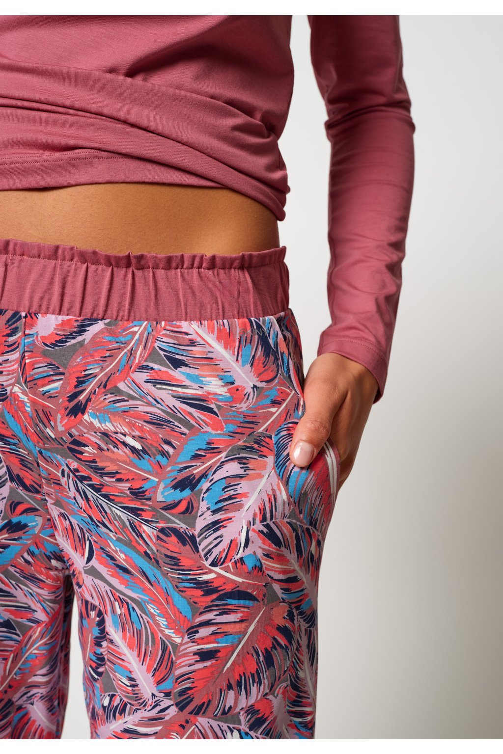 Štýl sa snúbi s maximálnym pohodlím: Tieto krásne pyžamové nohavice vyrobené z mäkkej zmesi modalu a bavlny sú obzvlášť pohodlné, a to aj na leňošenie. Široké nohavice a bočné vrecká zaisťujú skvelé pohodlie. Ženské volániky v páse sú vizuálnym prvkom, ktorý lichotí každej postave a každému vzhľadu.