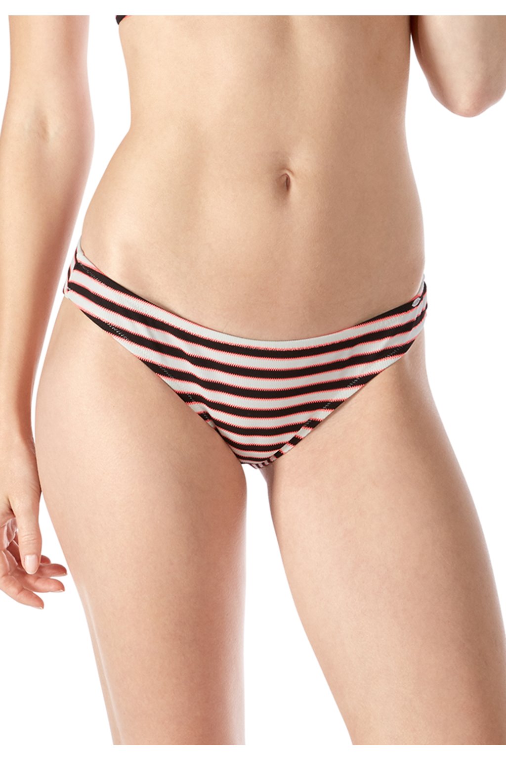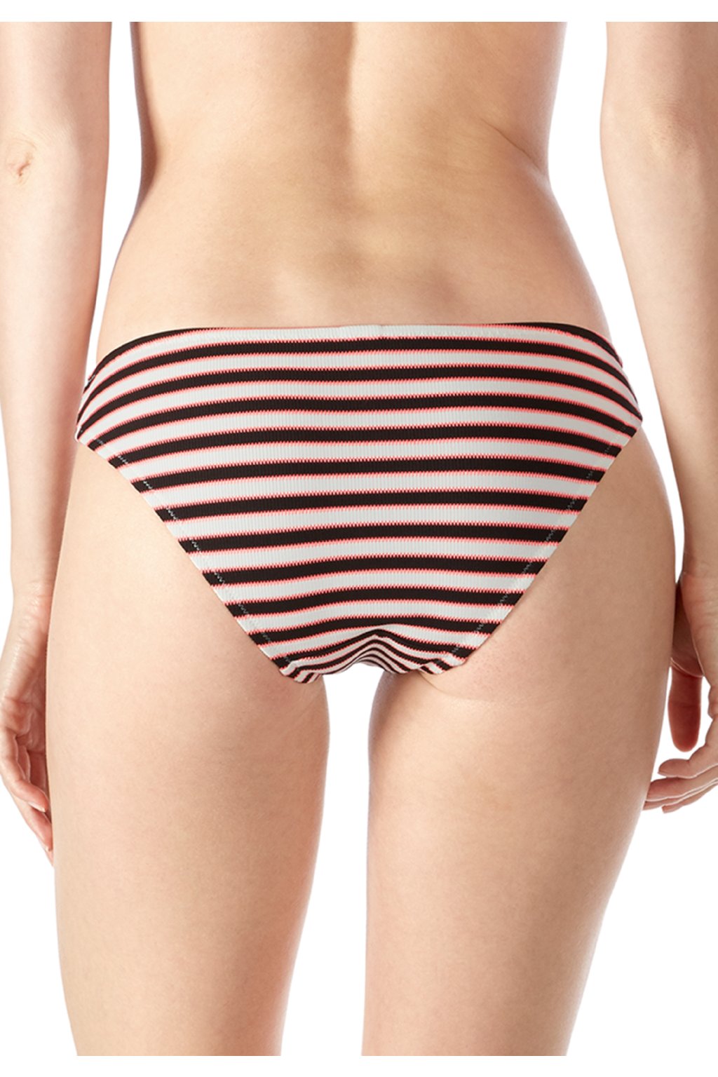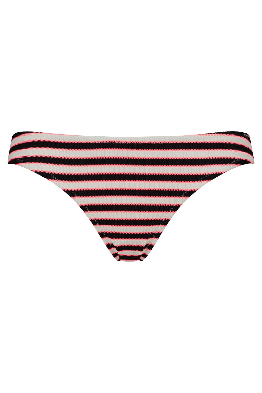 Športové bikinové nohavičky Rio zo štruktúrovaného mikrovlákna, námornícke pruhy v čiernej a neónovo ružovej farbe na bielom podklade, možno kombinovať s vrchnými dielmi bikín s košíčkami alebo trojuholníkovými vrchnými dielmi v rovnakom štýle, certifikované podľa Oeko-Tex Standard 100