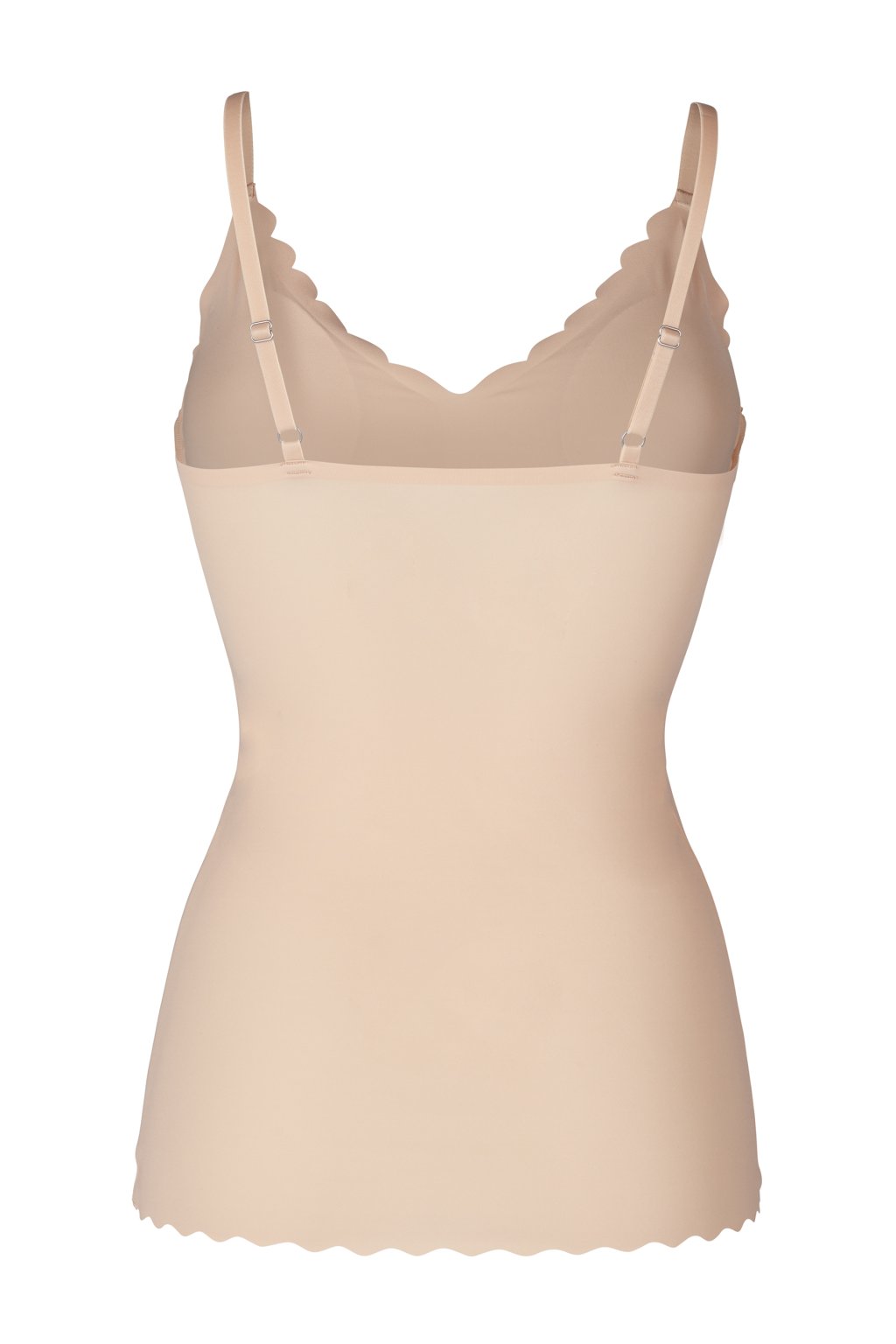 Špagetový top s odnímateľnými vypchávkami | Výstrih do V s vrúbkovaným okrajom | Podprsenka s nastaviteľnými ramienkami pre pevný strih | Ideálna na nosenie pod podprsenkou vďaka priliehavému strihu | Vrchný diel podprsenky z elastického a mäkkého mikrovlákna