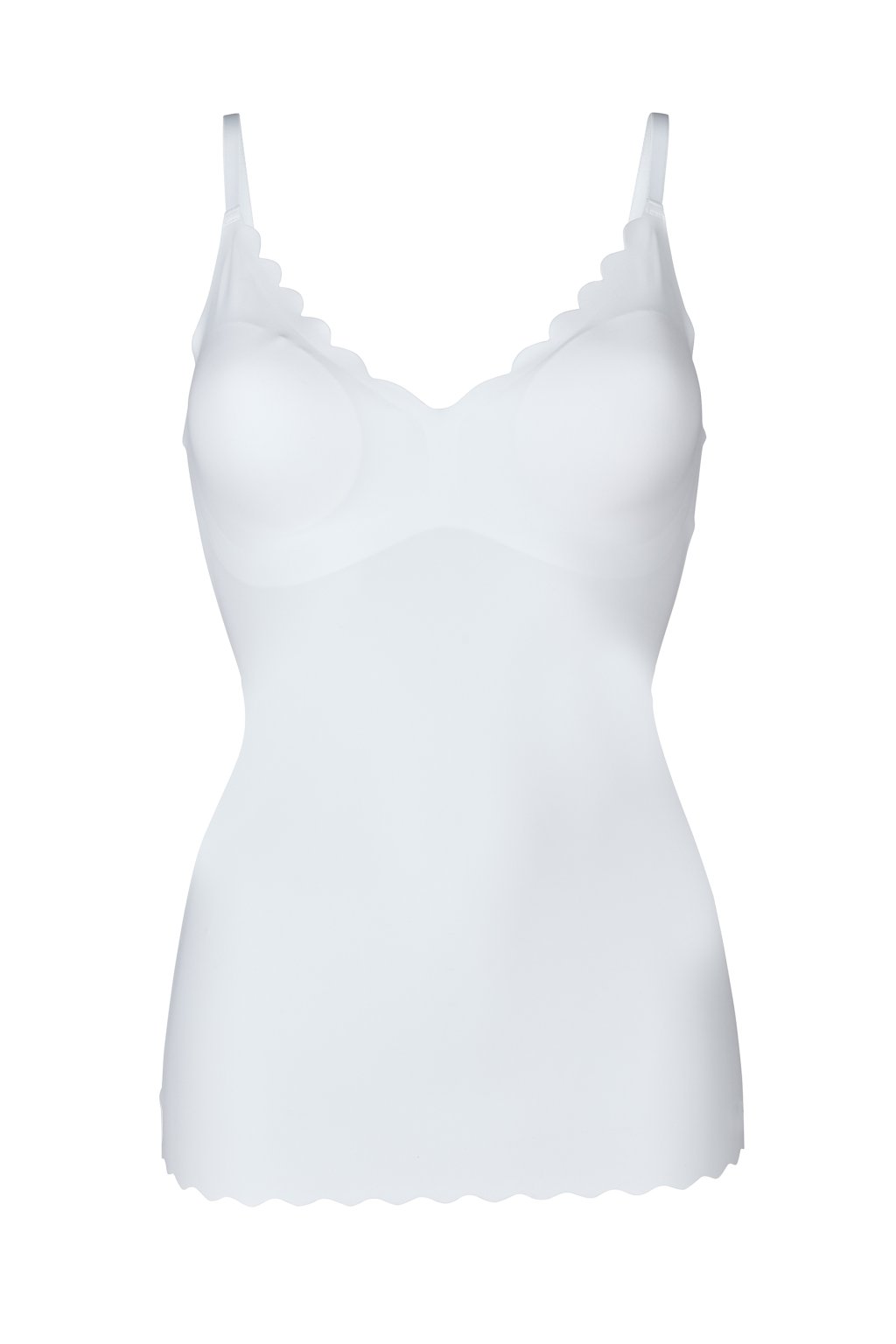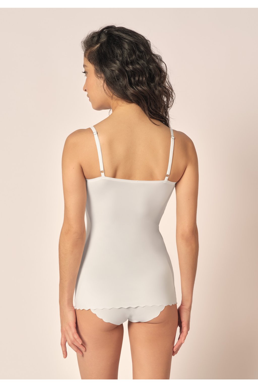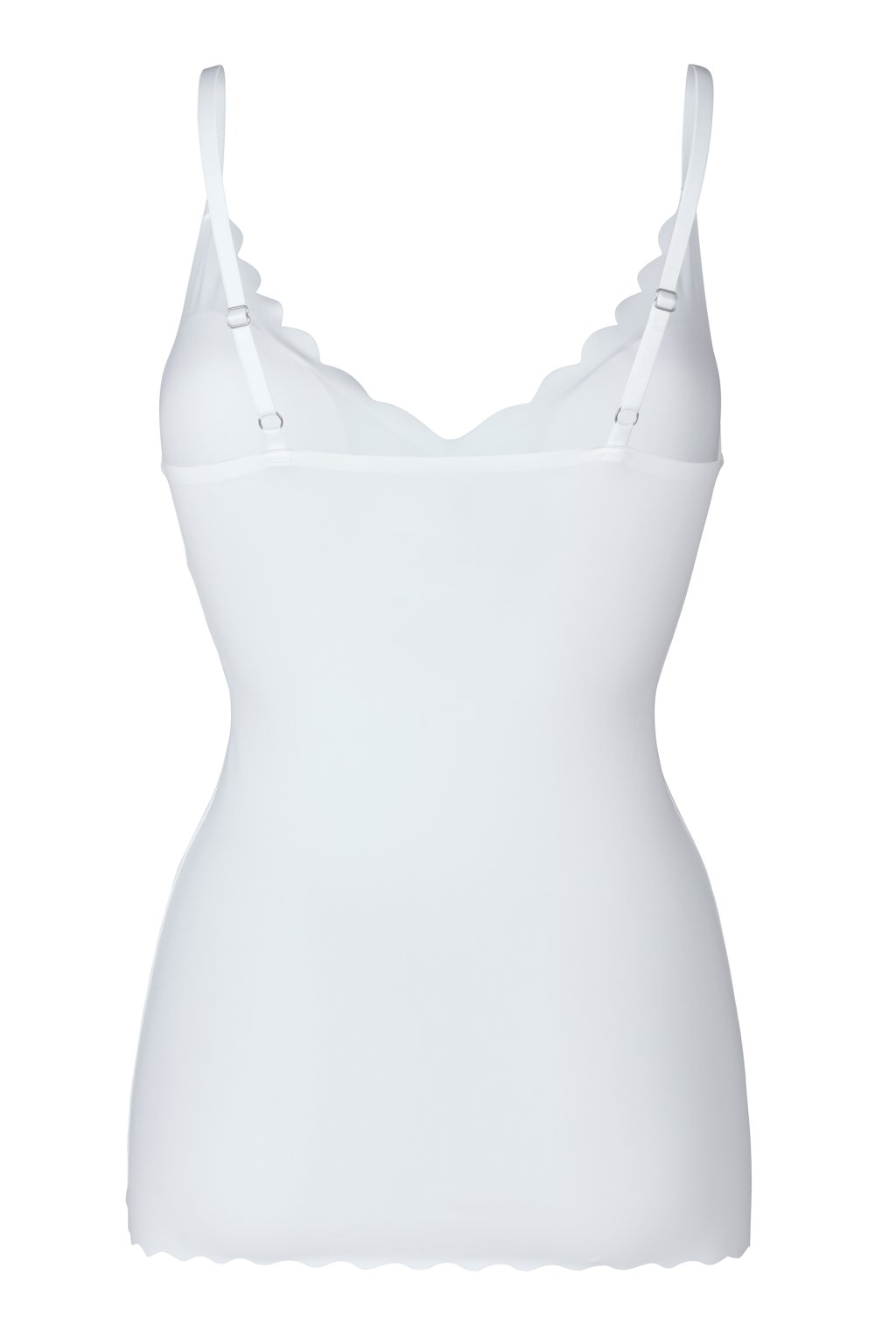 Špagetový top s odnímateľnými vypchávkami | Výstrih do V s vrúbkovaným okrajom | Podprsenka s nastaviteľnými ramienkami pre pevný strih | Ideálna na nosenie pod podprsenkou vďaka priliehavému strihu | Vrchný diel podprsenky z elastického a mäkkého mikrovlákna
