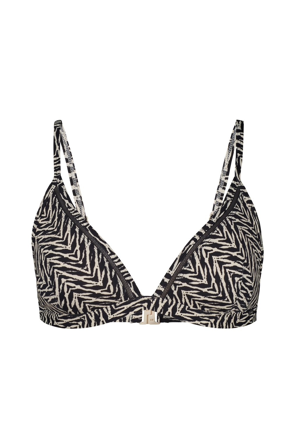 Vrchný diel bikín s vystuženou trojuholníkovou podprsenkou. Pekne orezané okraje, ktoré sa predlžujú a vytvárajú látkové ramienka, Sieťované detaily pozdĺž okraja košíčkov podprsenky. Elastický pás pod prsiami, nastaviteľné ramienka a zapínanie na sponu. Plavky vyrobené z elastického mikrovlákna a recyklovaného polyamidu.