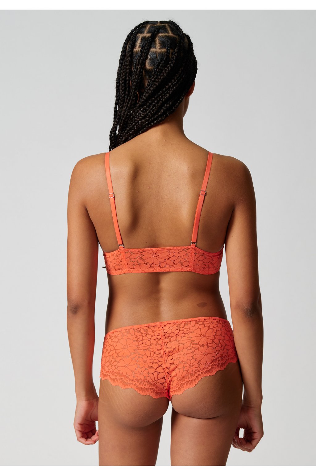 Nevystužená podprsenka bez kostice | Košíčky, boky a kostica s čipkovým poťahom | Optimálna podpora vďaka elastickej kostici | Nastaviteľné ramienka pre individuálne pohodlie | Kvetinový dizajn v transparentnom vzhľade