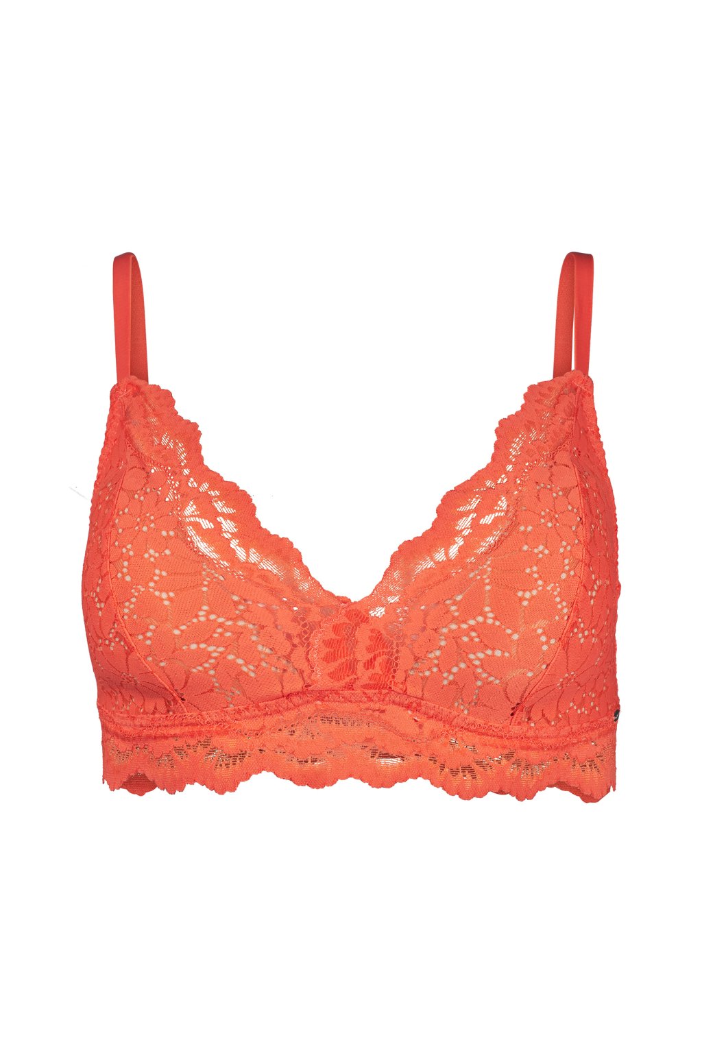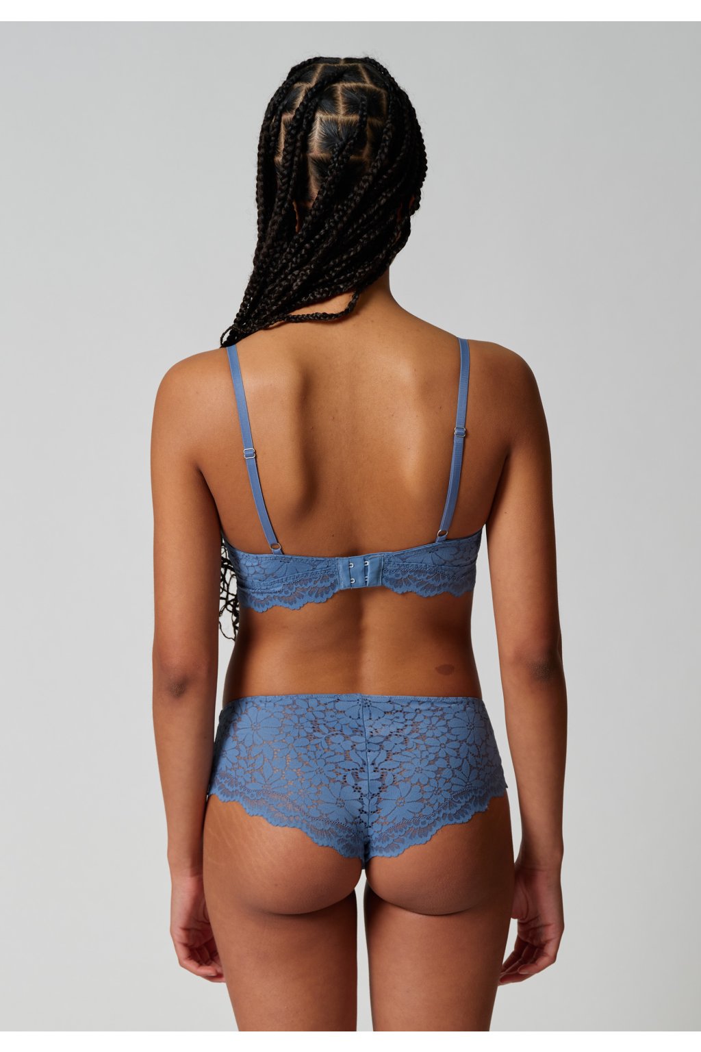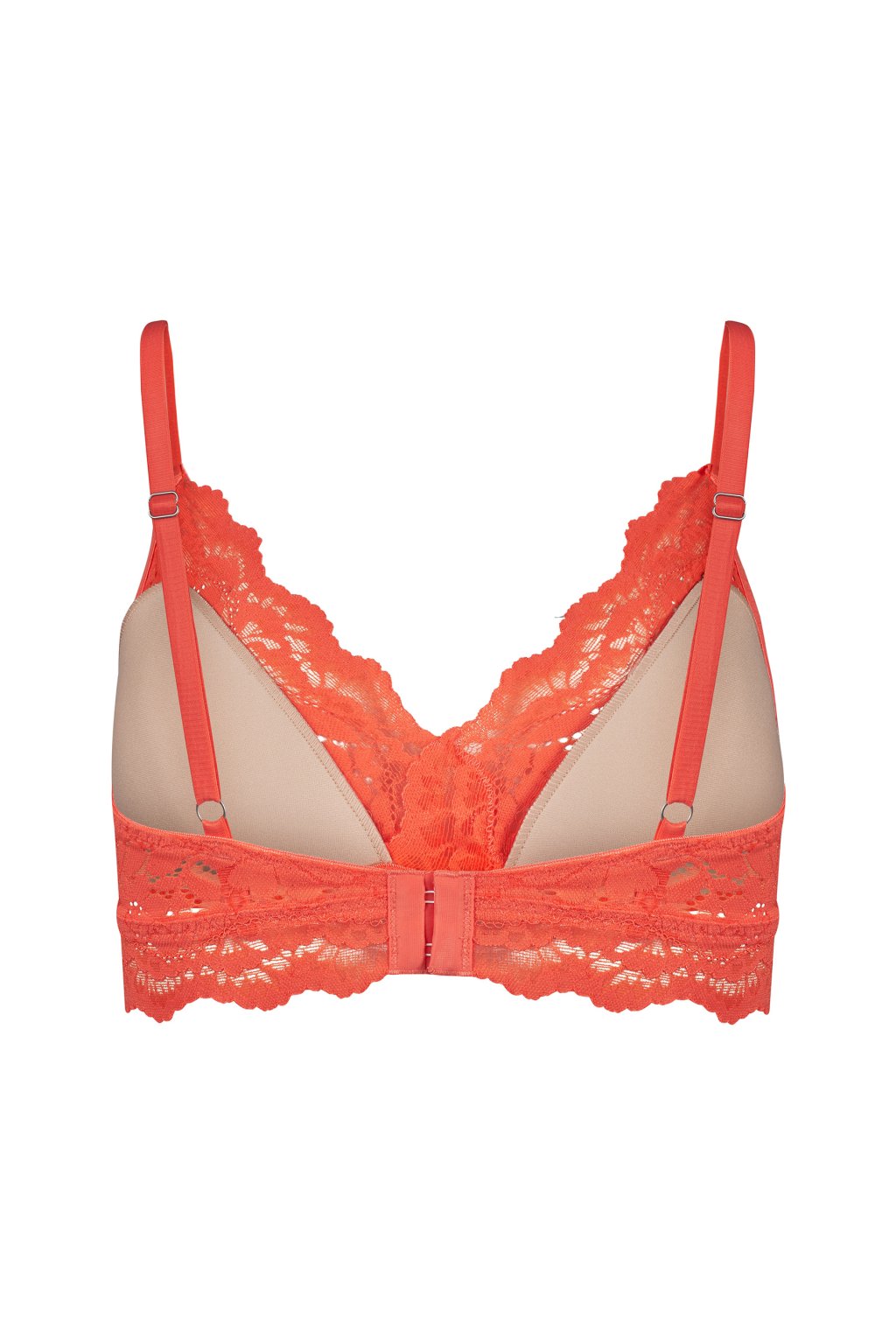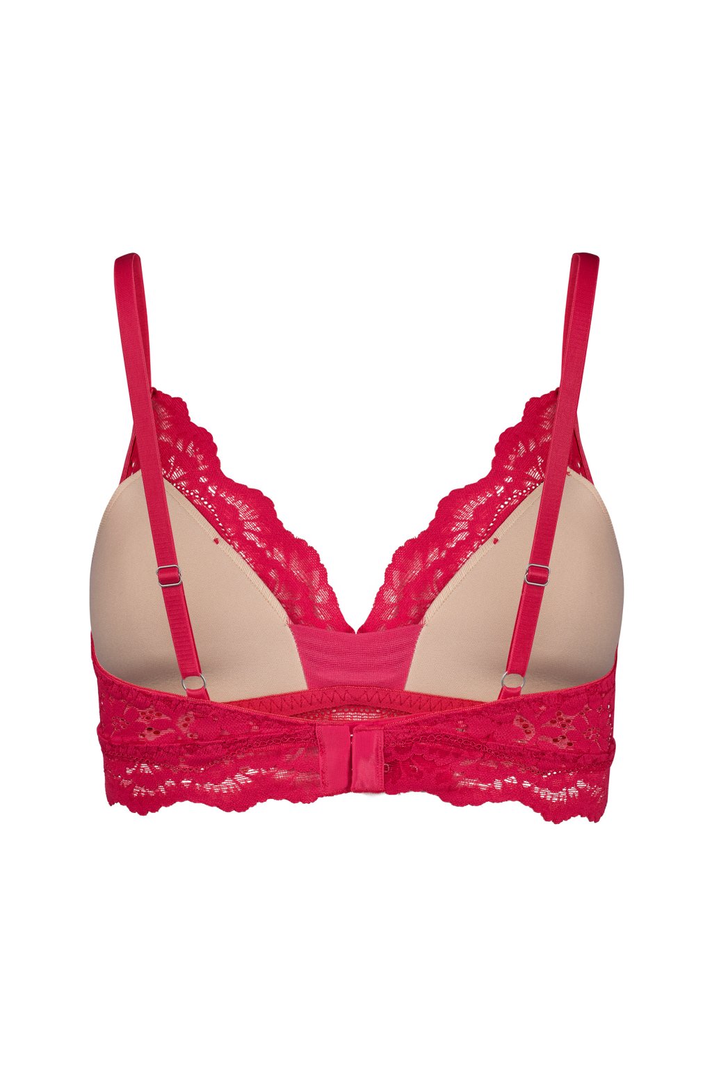 Dámska trojuholníková podprsenka bez kostice | Integrované vypchávky pre maximálne pohodlie | Košíčky, boky a spodná časť podprsenky s plnou čipkou | Nastaviteľné ramienka a zapínanie na háčiky | Elastická čipka s kvetinovým vzorom