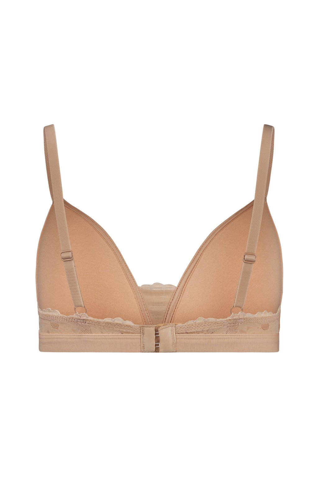 Vystužená podprsenka s trojuholníkovými košíčkami bez kostice | Krásna čipkovaná vložka medzi košíčkami | Mäkká bavlna pre maximálne pohodlie | Spodná bielizeň s ozdobnou čipkou na bočnom mostíku | Nastaviteľné ramienka a zapínanie na háčiky na chrbte