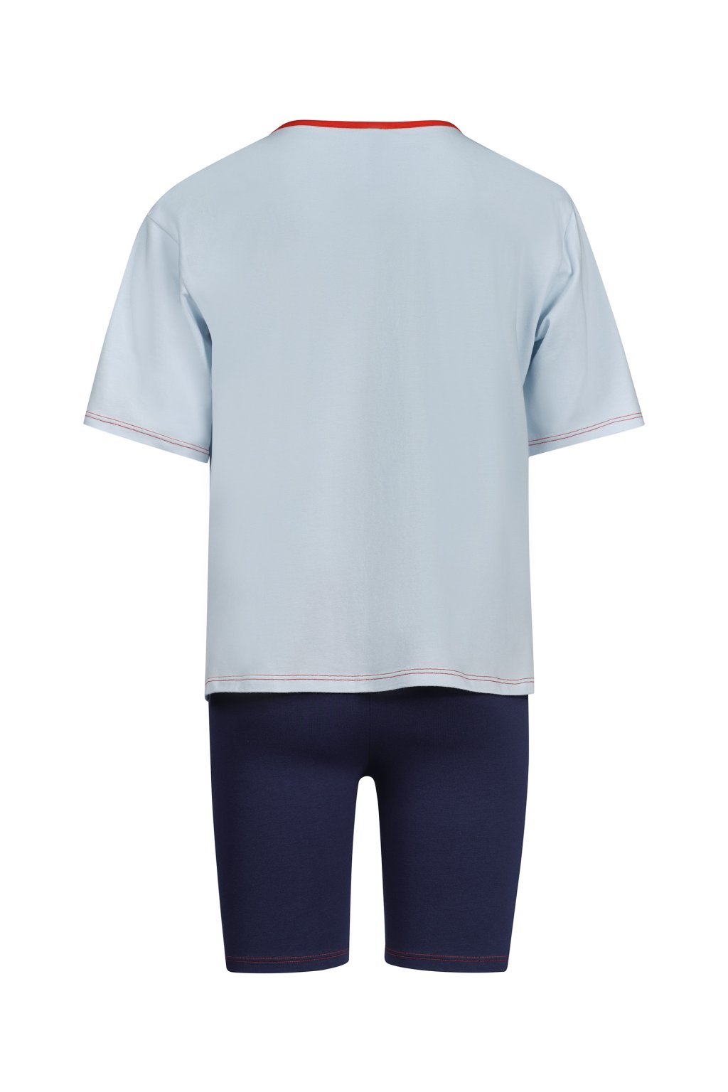 Pyžamový komplet pozostávajúci z trička a nohavíc | Krátke tričko s okrúhlym výstrihom a rovným strihom | Nočná bielizeň s krátkymi cyklistickými šortkami | Mäkký elastický pás pokrytý látkou | Odolný jednoduchý džersej z mäkkej elastickej bavlny