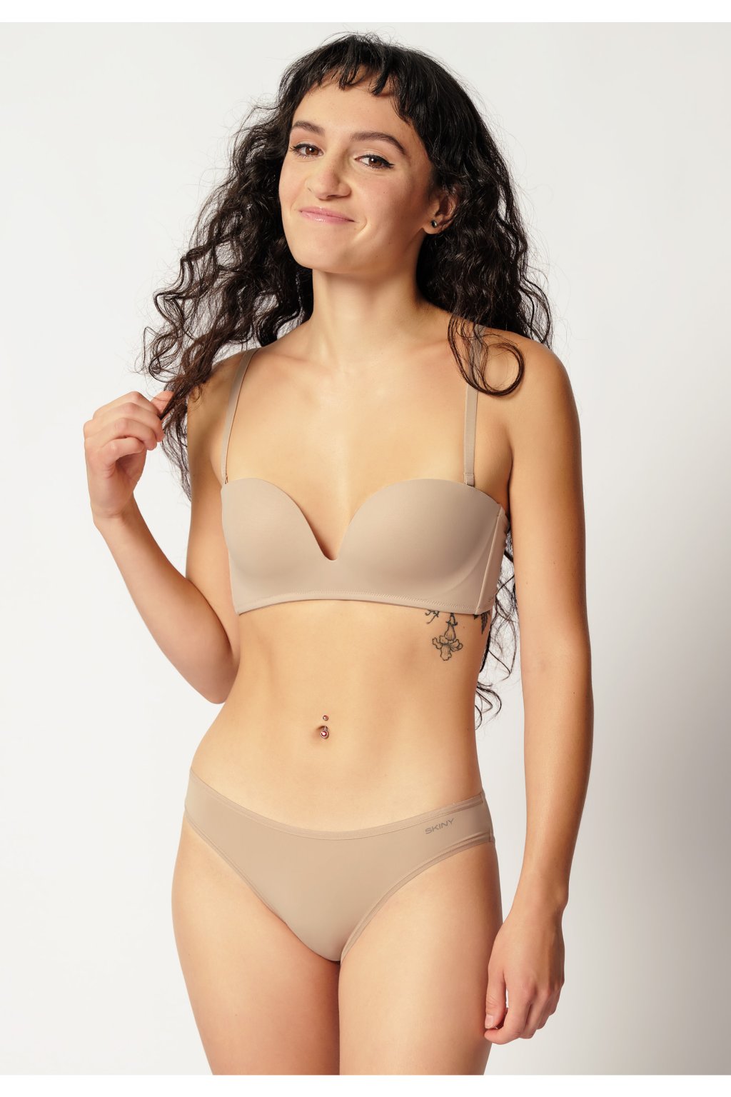 Podprsenka bez ramienok s košíčkami bez kostíc. Vystužené košíčky. Hlboký výstrih. Nastaviteľné a odnímateľné ramienka, ktoré sa dajú prekrížiť. Nastaviteľné zapínanie na suchý zips.