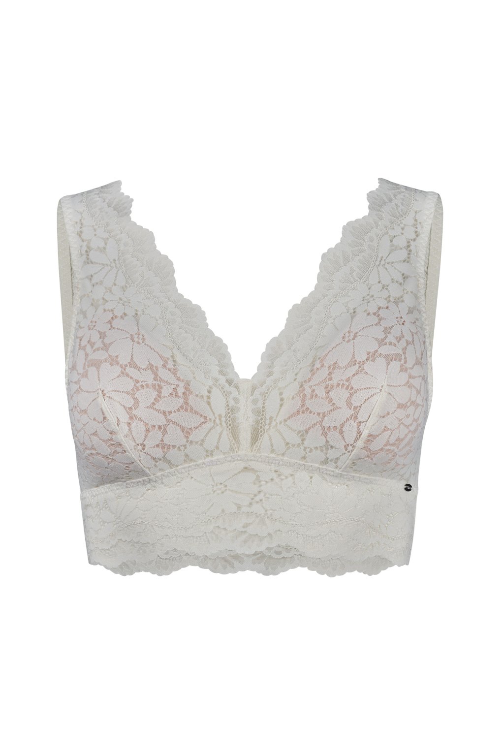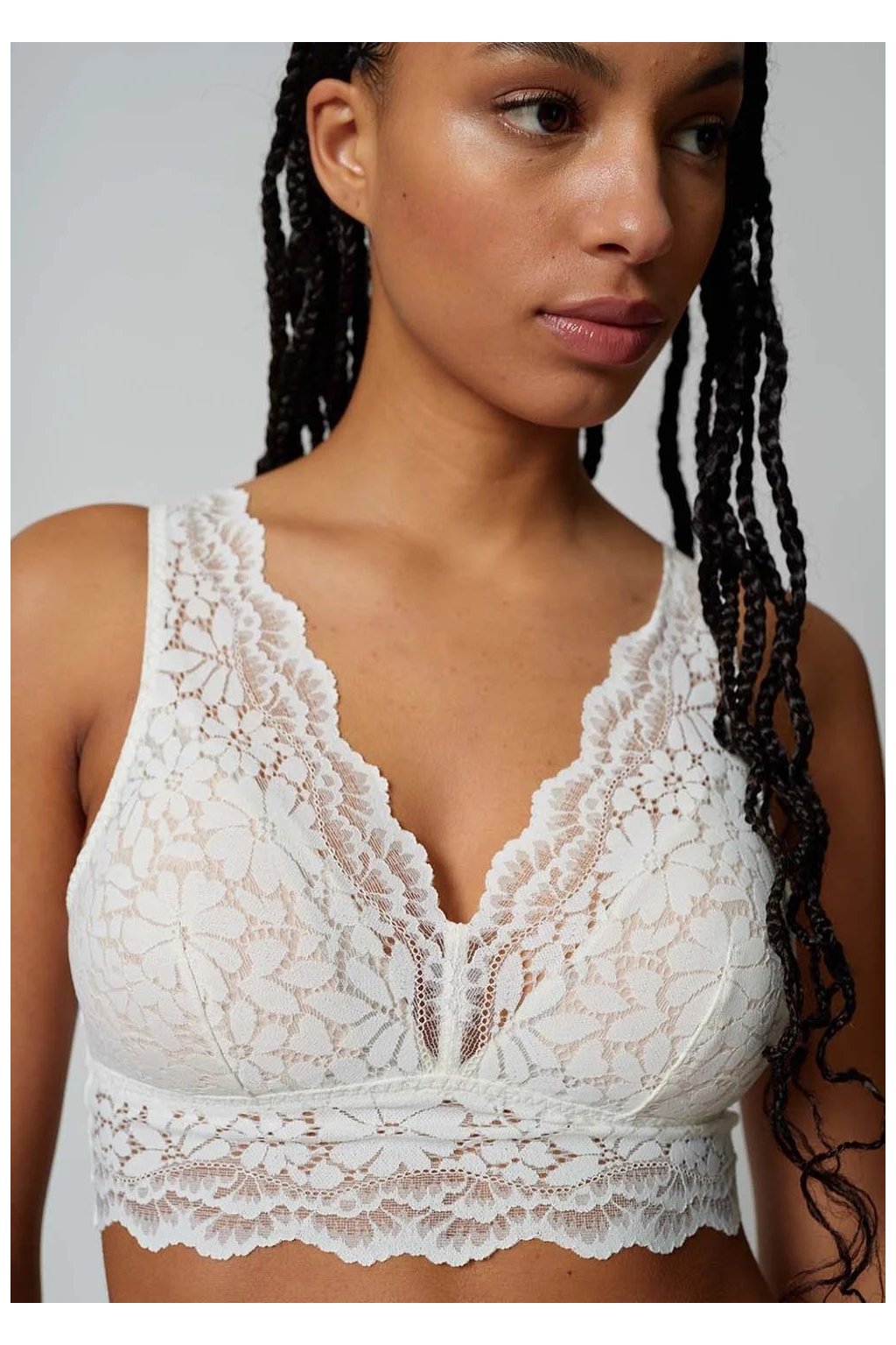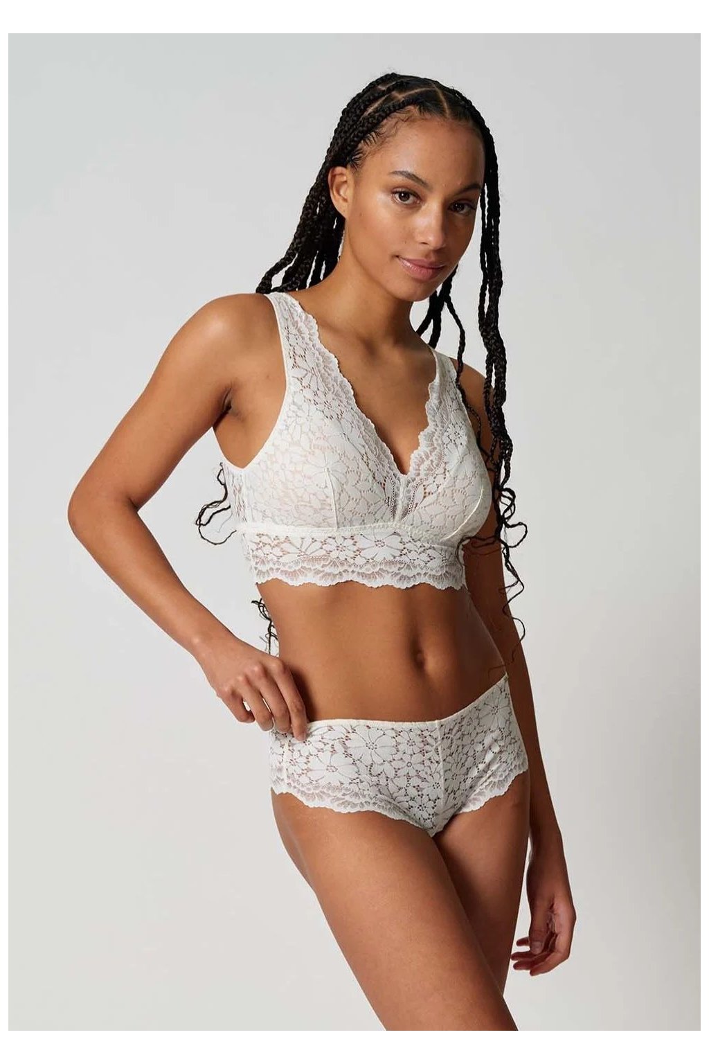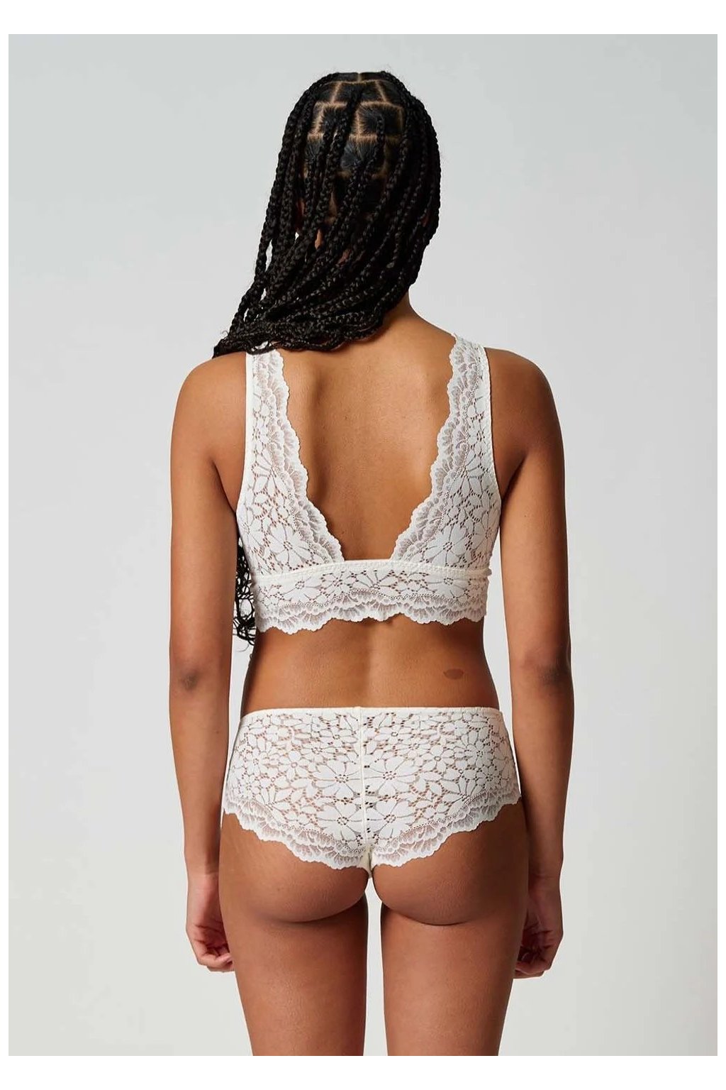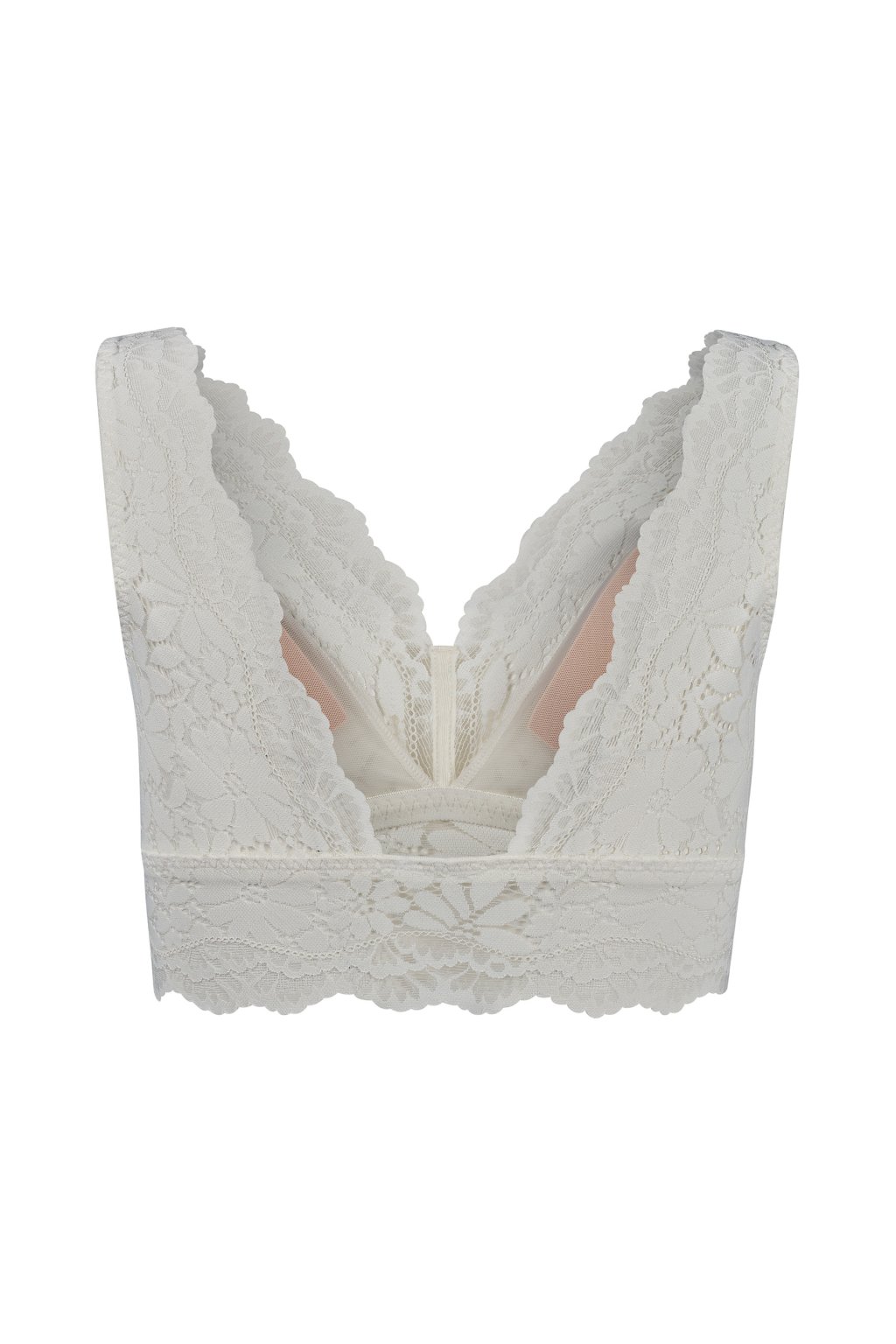 Dámsky crop top s vyberateľnými vypchávkami | Čipka na košíčkoch, na bokoch a pod prsiami | Výstrih do V v dekolte a na chrbte | Elastický podbruško pre dobrú podporu | Recyklovaná čipka v kvetinovom vzhľade