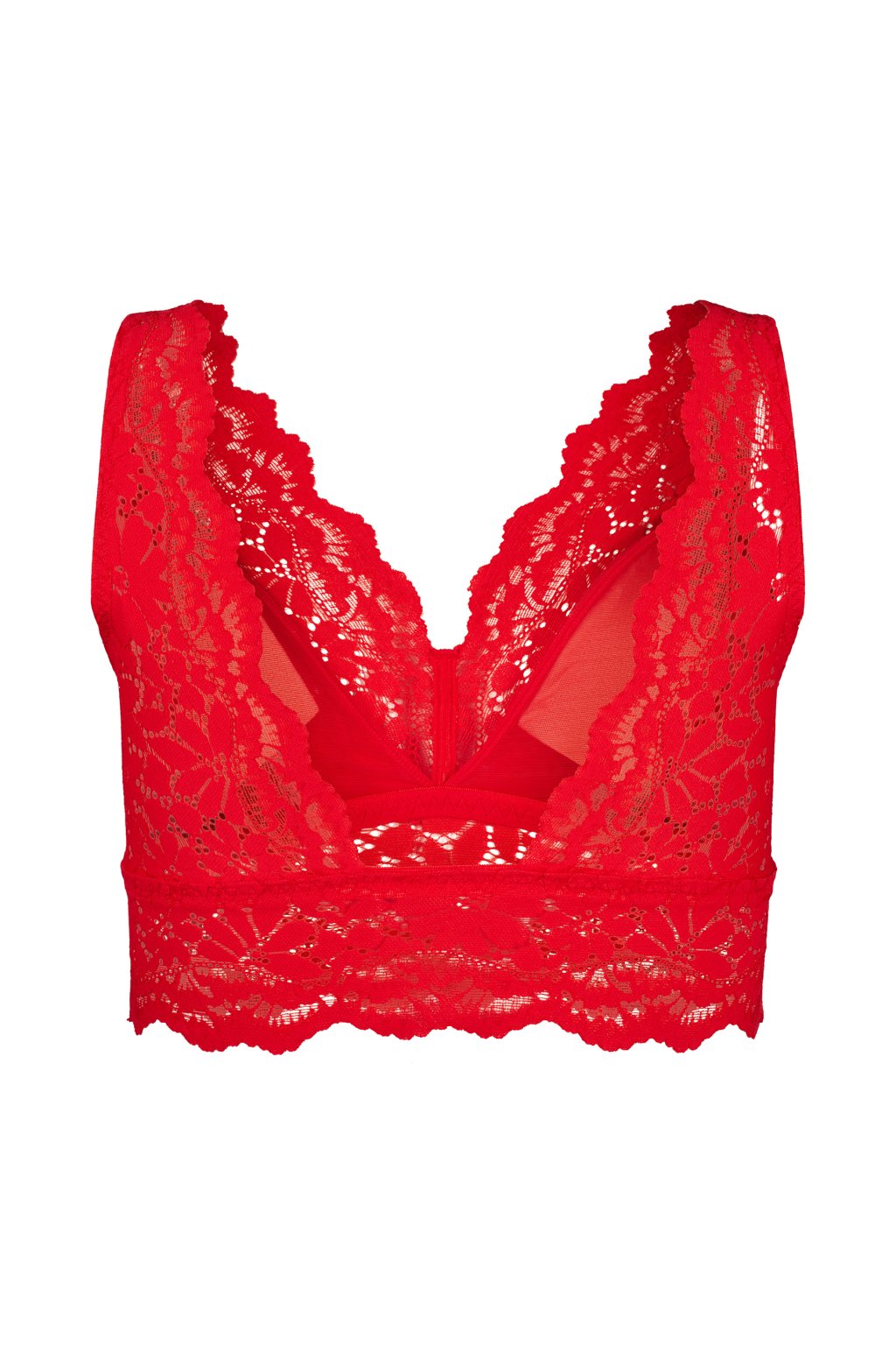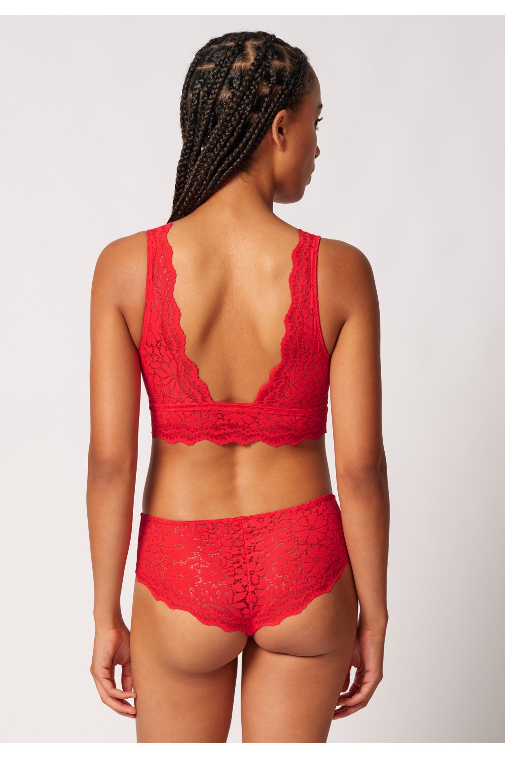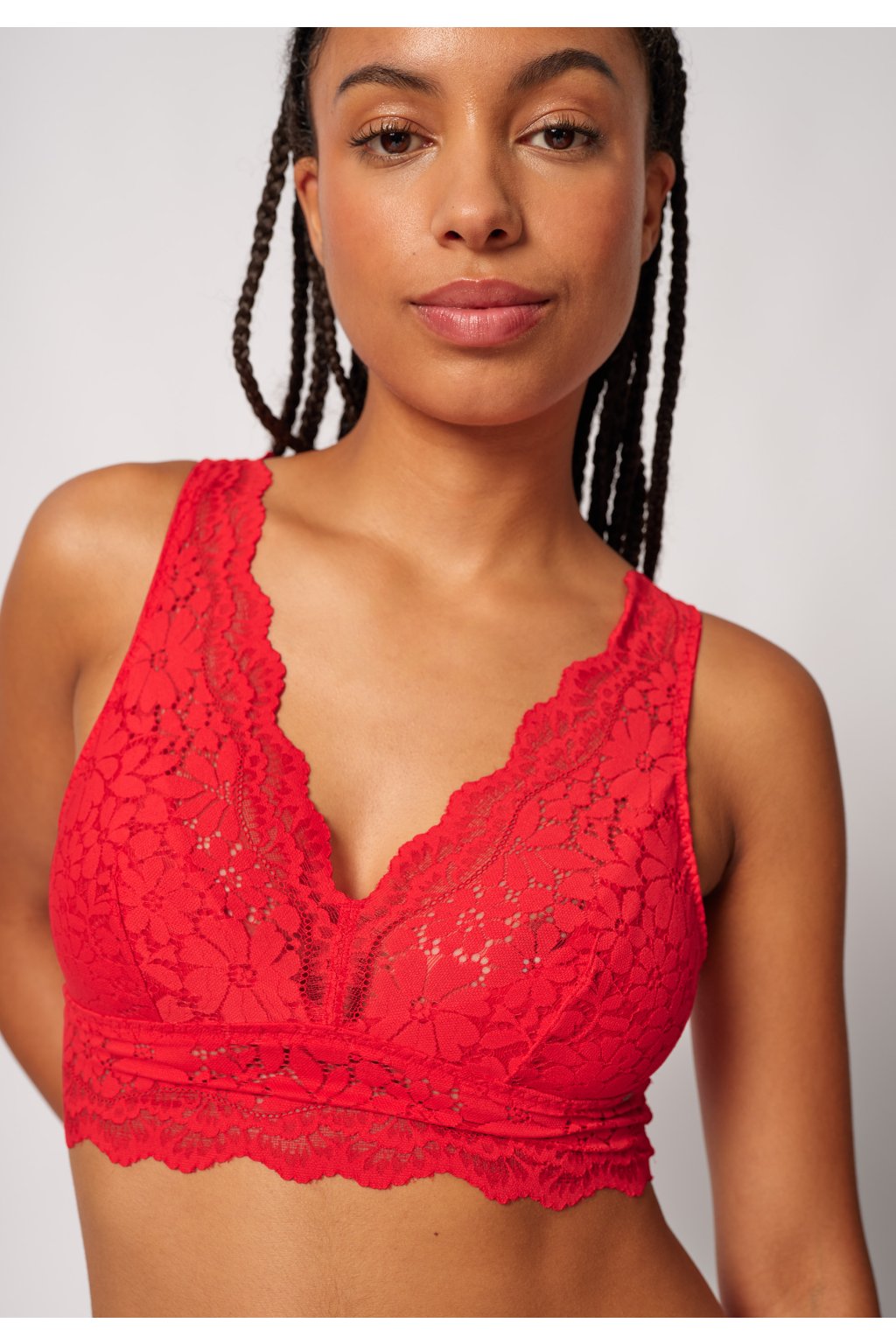 Dámsky crop top s vyberateľnými vypchávkami | Čipka na košíčkoch, na bokoch a pod prsiami | Výstrih do V v dekolte a na chrbte | Elastický podbruško pre dobrú podporu | Recyklovaná čipka v kvetinovom vzhľade