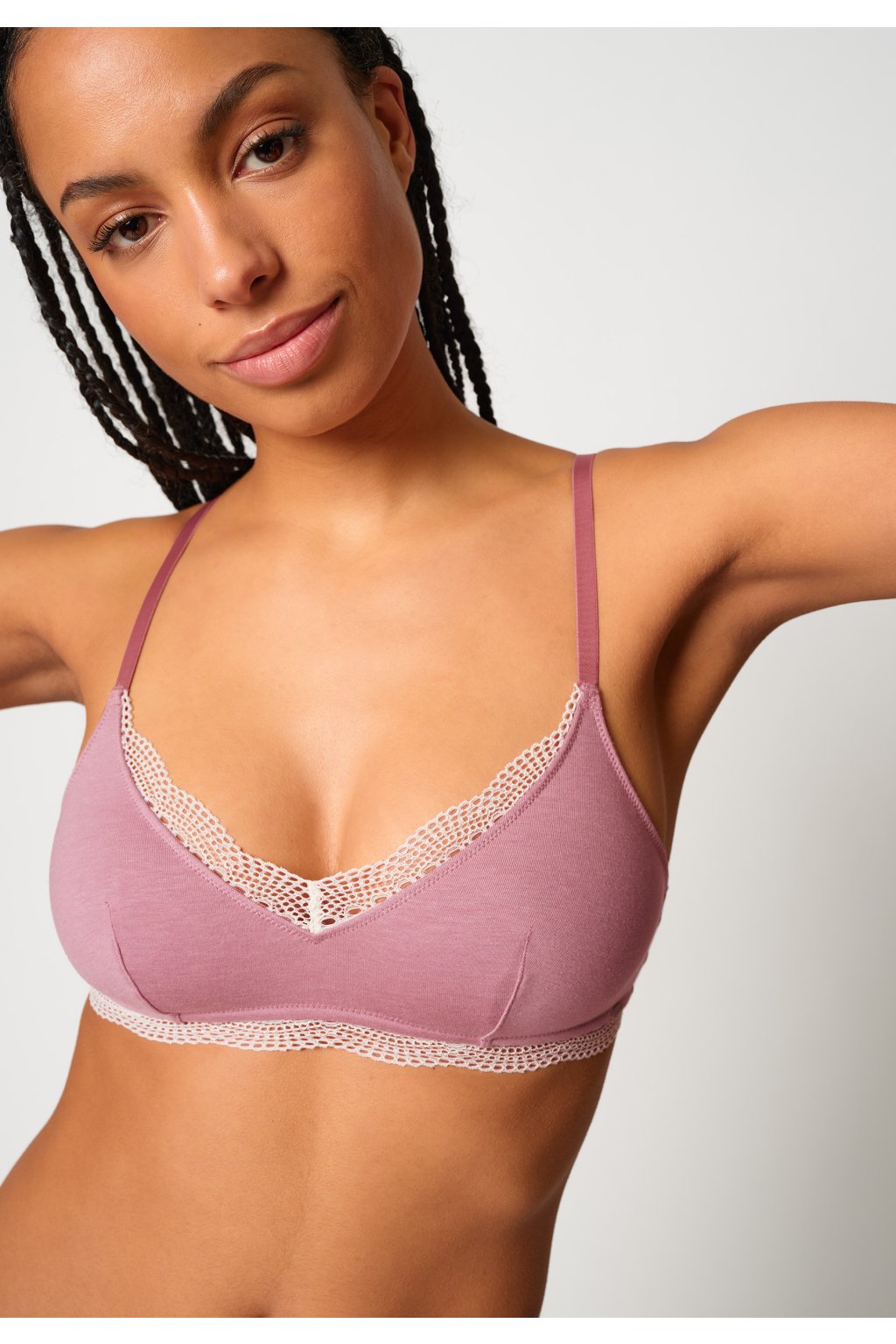 Mäkká podprsenka bez kostice a s vyberateľnými vypchávkami | Dostupné v dvojitých veľkostiach A/B a C/D | Výstrih do V s priehľadnou čipkou | Podprsenka s celoobvodovým čipkovaným pásom | Nastaviteľné ramienka a zapínanie na háčik
