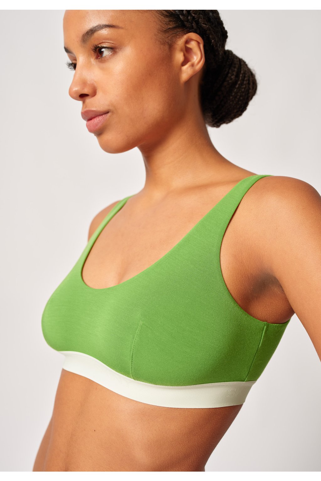 Podprsenka s odnímateľnými vypchávkami a výstrihom do V|Úzka elastická guma pri krku a otvore na ramená|Obojstranne vyrobené z mäkkého TENCEL Modal|Použitá guma pod prsiami pre bezpečné uchytenie|Zodpovedne vyrobené vlákno TENCEL Modal