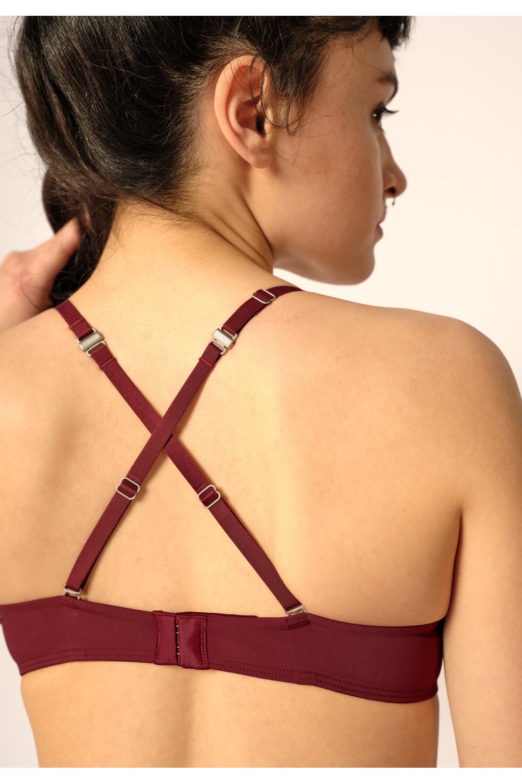 Podprsenka s kosticami a vystuženými košíčkami | Čistá povrchová úprava pre neviditeľný efekt | Jednotlivé ramienka: rovné, krížové alebo do polovice krku | Nastaviteľné zapínanie na háčiky na chrbte | Spodná bielizeň z elastického a pohodlného mikrovlákna