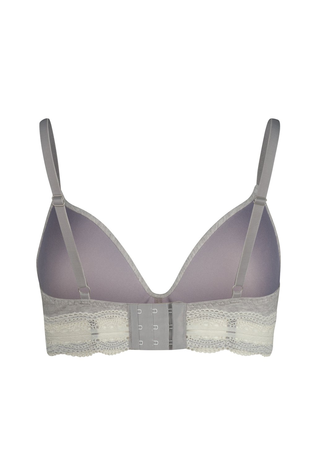 Trojuholníková podprsenka bez kostíc s vypchávkami | Košíčky potiahnuté strečovou bavlnou | Jemná čipka na zadnom páse pod prsiami | Individuálne nastaviteľné ramienka | Zapínanie na háčik vzadu