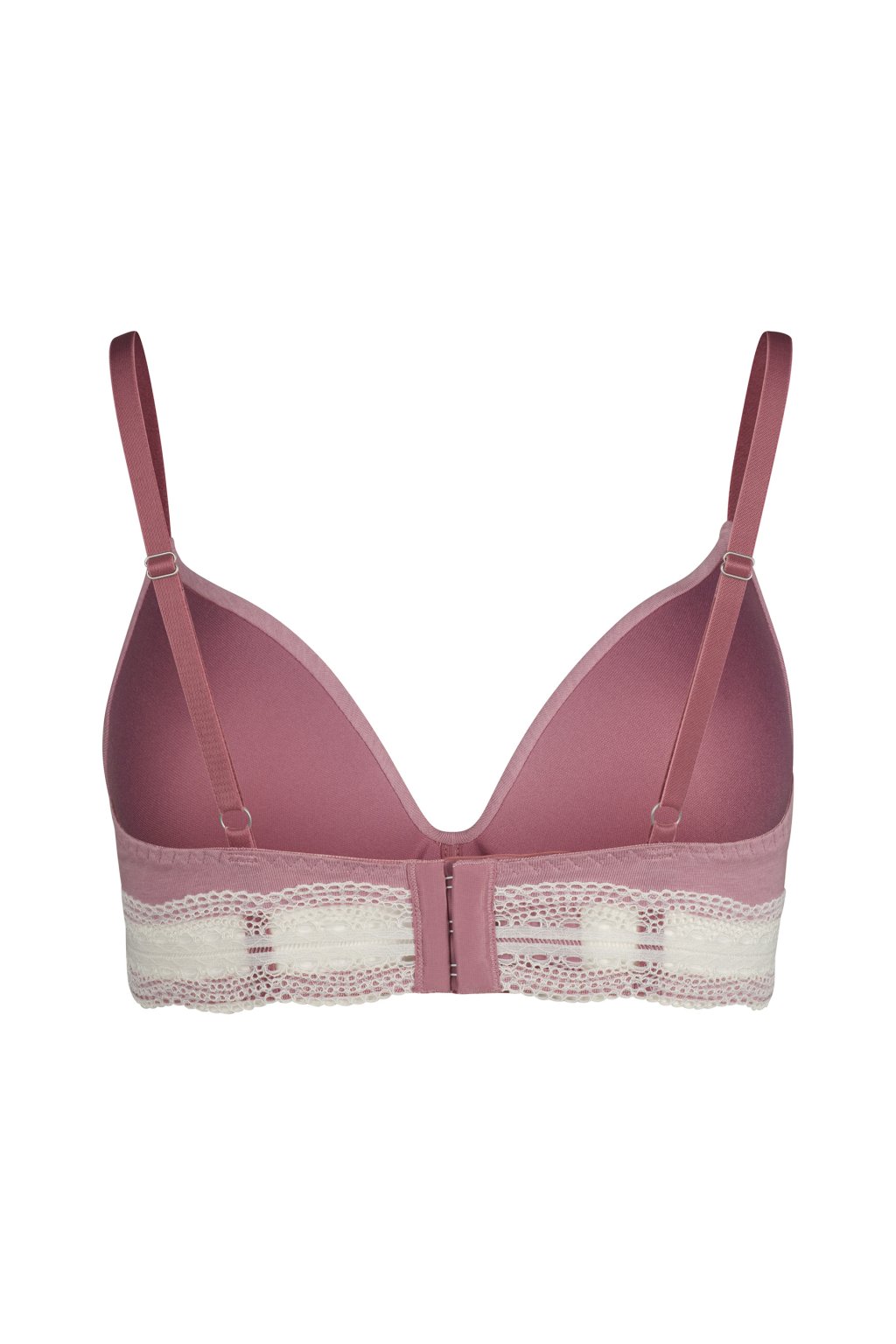 Trojuholníková podprsenka bez kostíc s vypchávkami | Košíčky potiahnuté strečovou bavlnou | Jemná čipka na zadnom páse pod prsiami | Individuálne nastaviteľné ramienka | Zapínanie na háčik vzadu